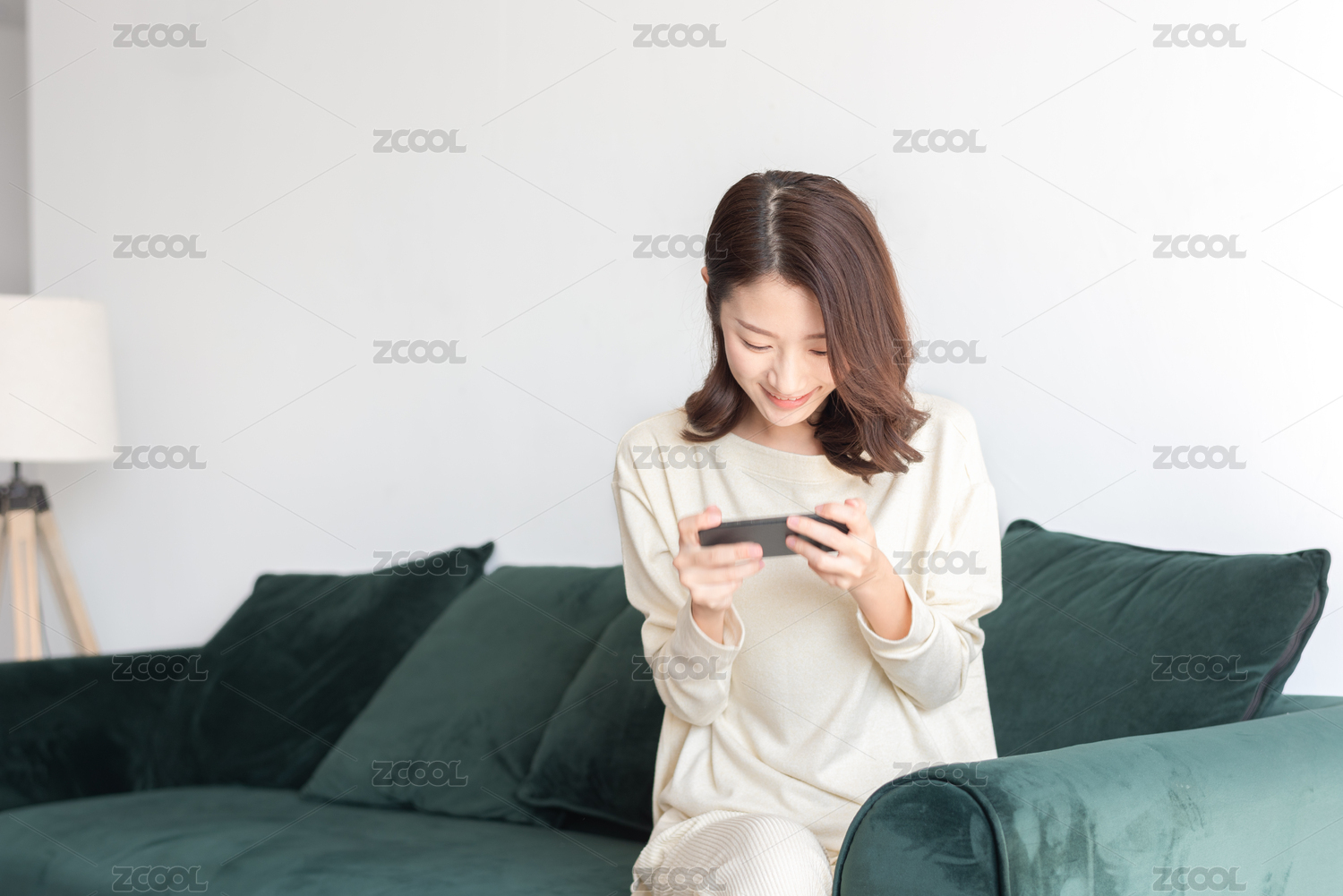一名年轻女性在家里的客厅坐在沙发上玩手机