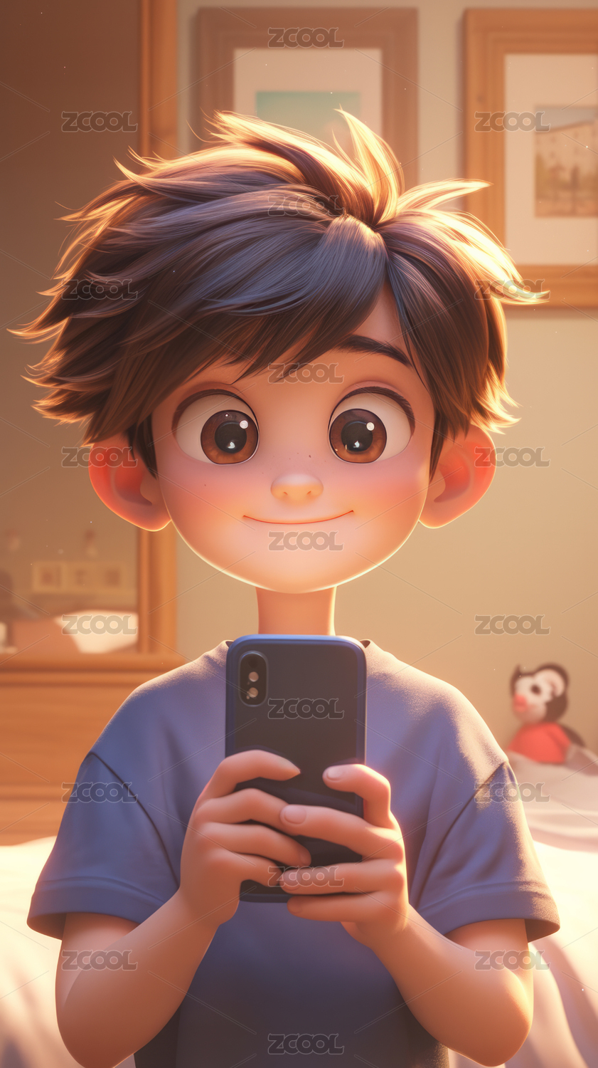 孩子对着电脑带耳机露出惊讶表情3D卡通
