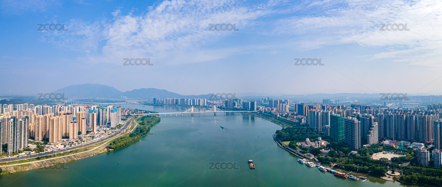 中国广东省清远市北江两岸建筑桥梁航拍景观