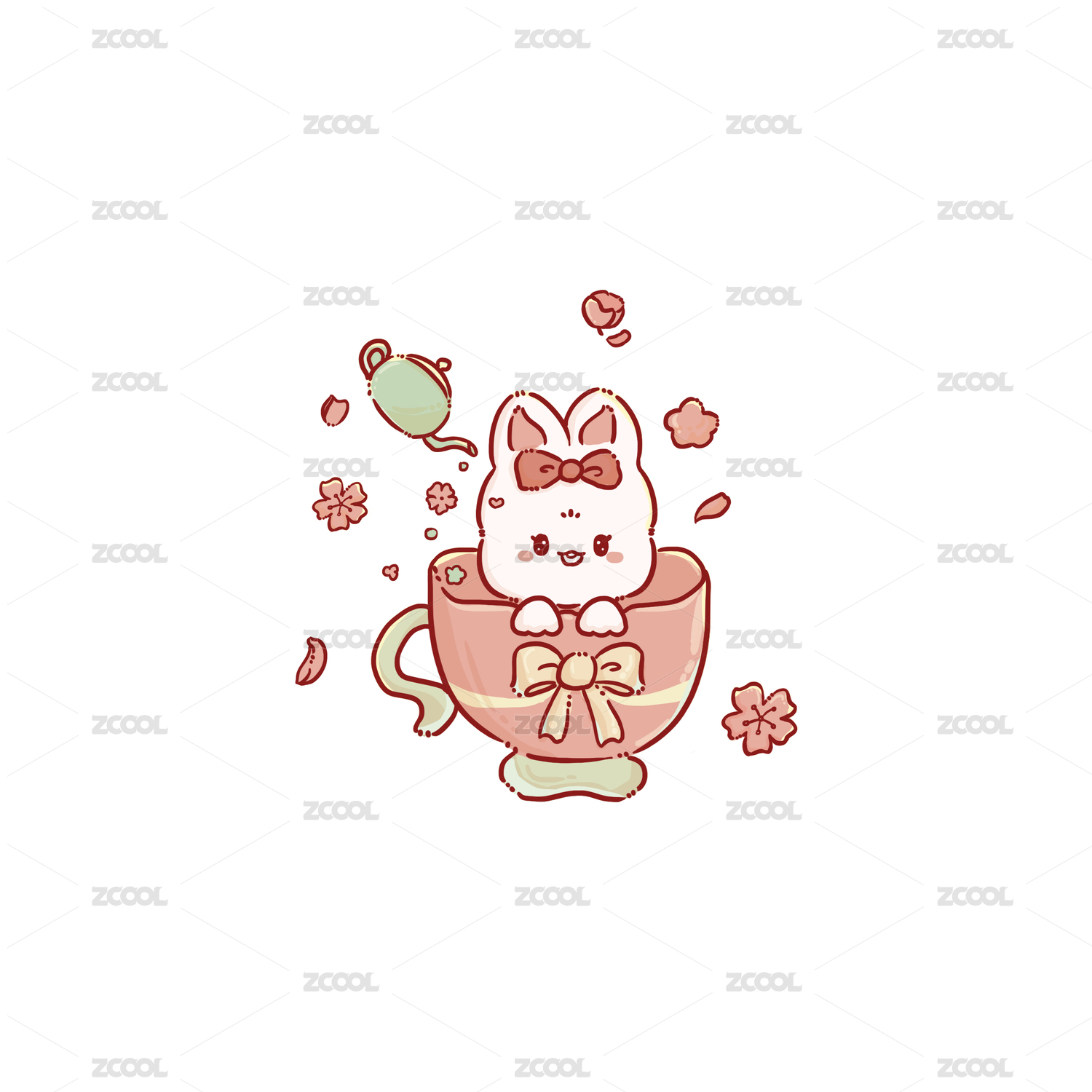 可爱清新小兔喝奶茶彩虹草莓格纹手绘插画