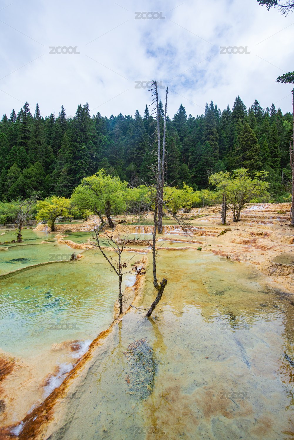 四川,黄龙,雨天,靛蓝,树木,瑶池,五彩池,彩池,水,地质