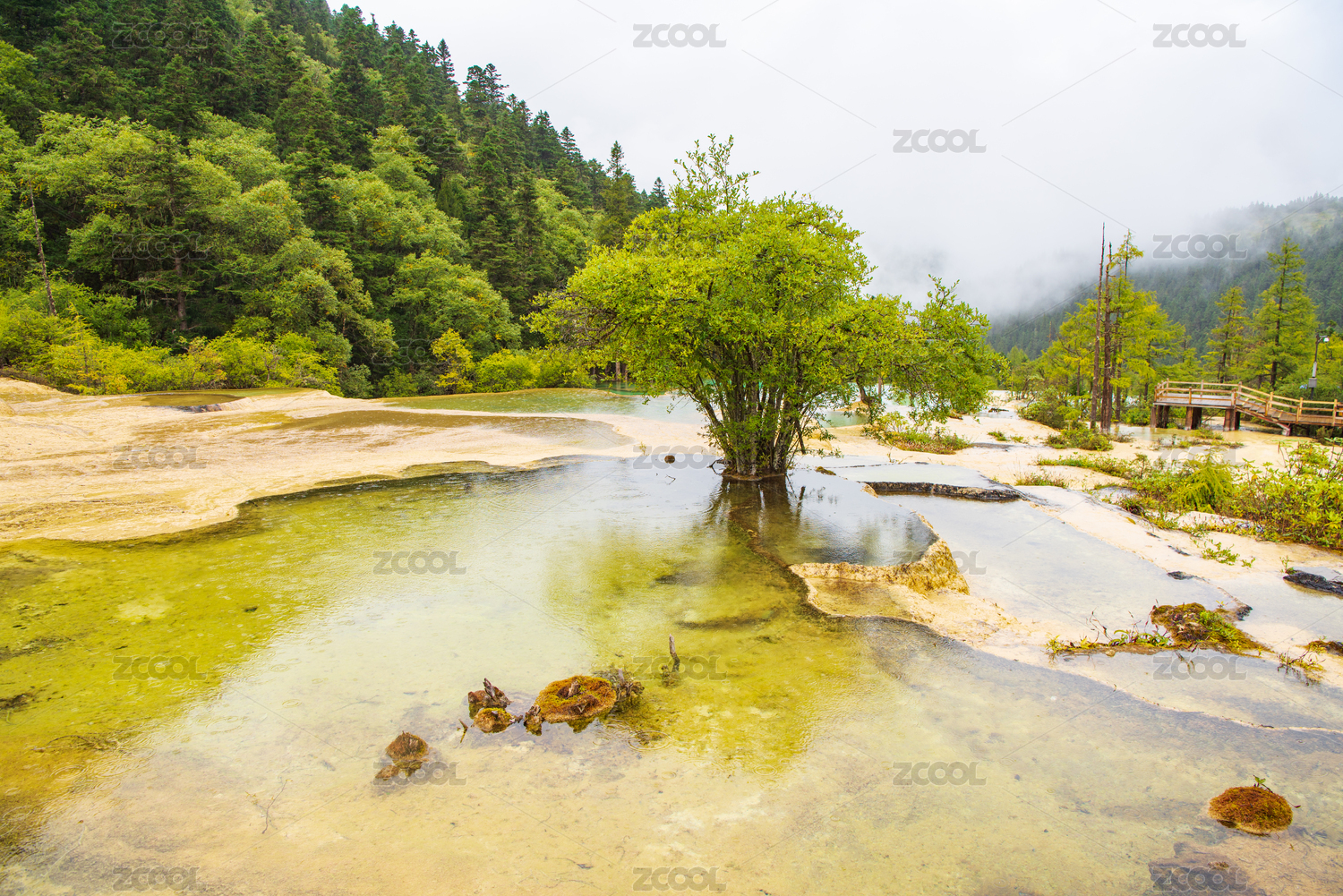 四川,黄龙,雨天,靛蓝,树木,瑶池,五彩池,彩池,水,地质
