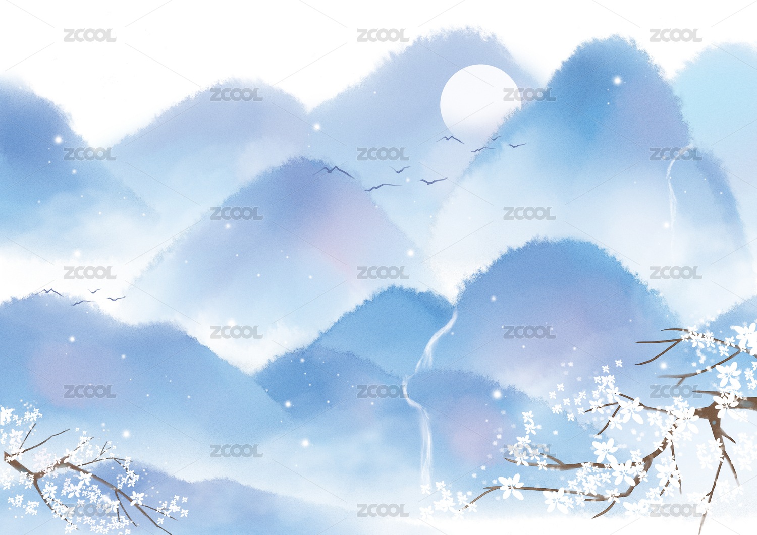 蓝色水墨风霜降国风水墨风景山峦树枝月亮