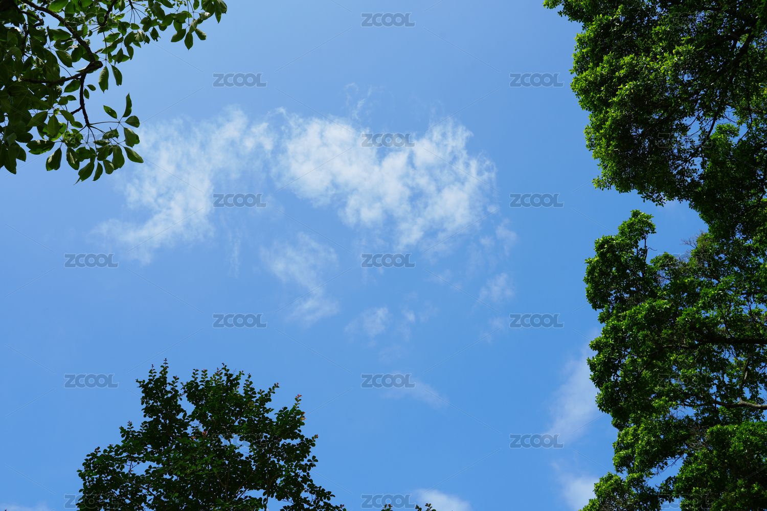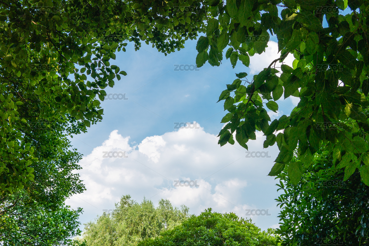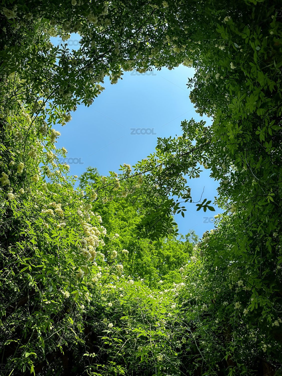 晴朗的蓝天下仰望绿色的春天,树洞风景。