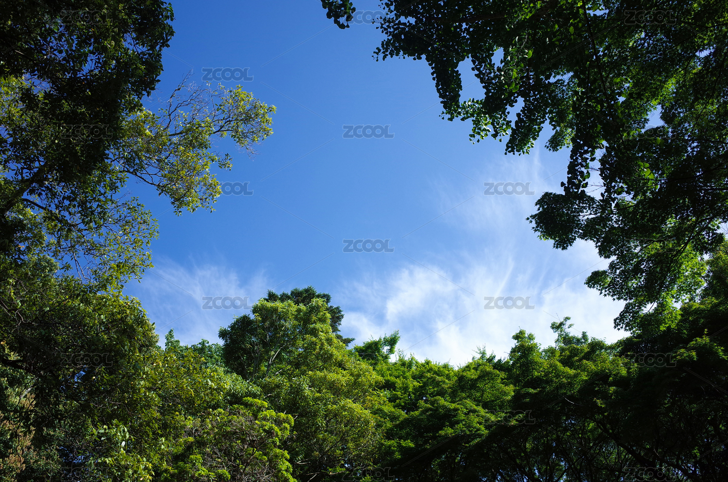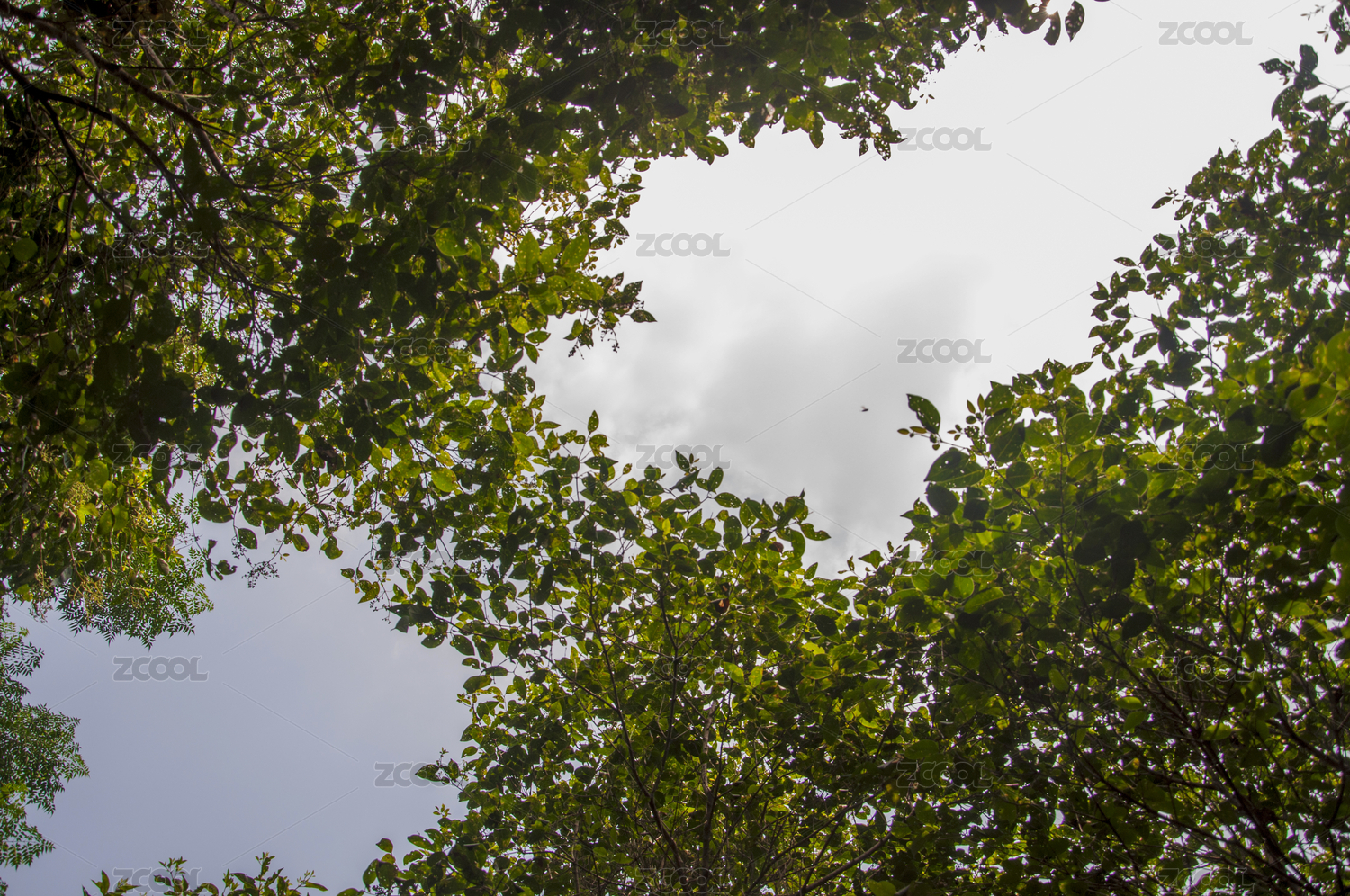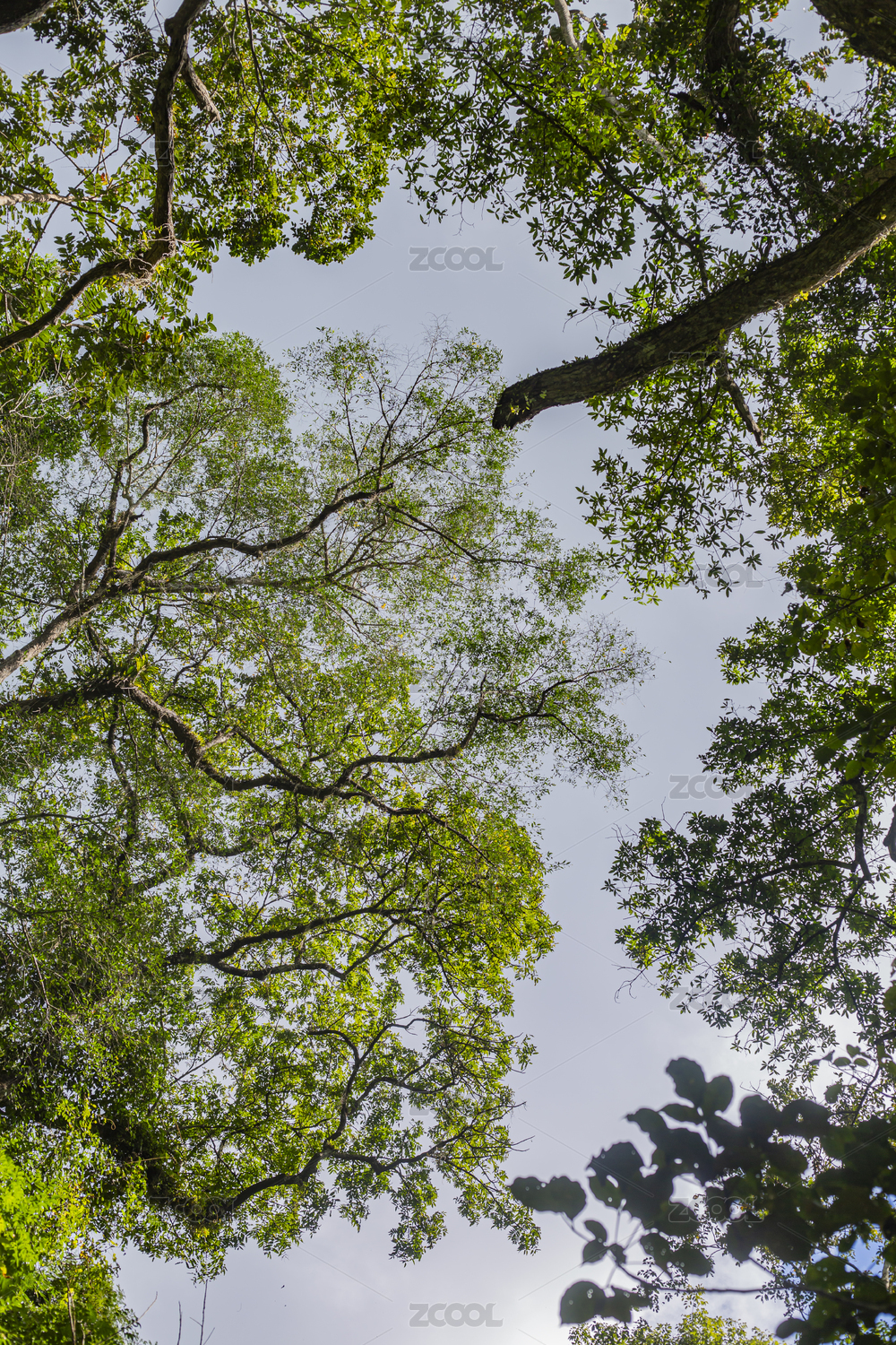 晴朗的蓝天下仰望绿色的春天,树洞风景。