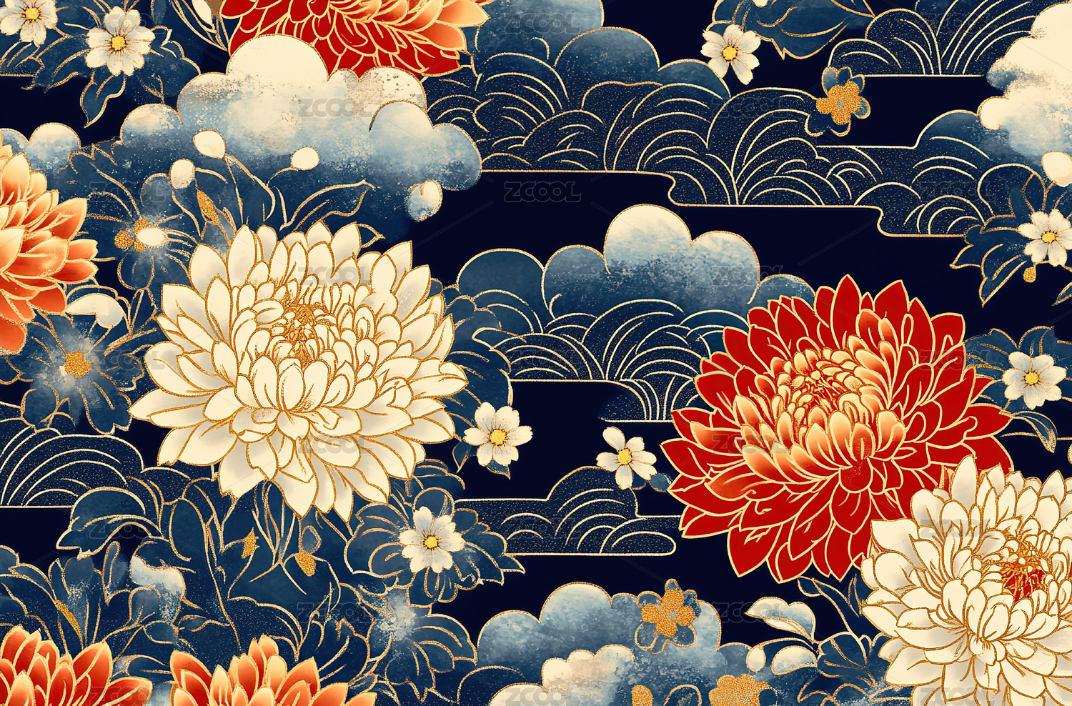 红底金菊祥云中式花卉图案