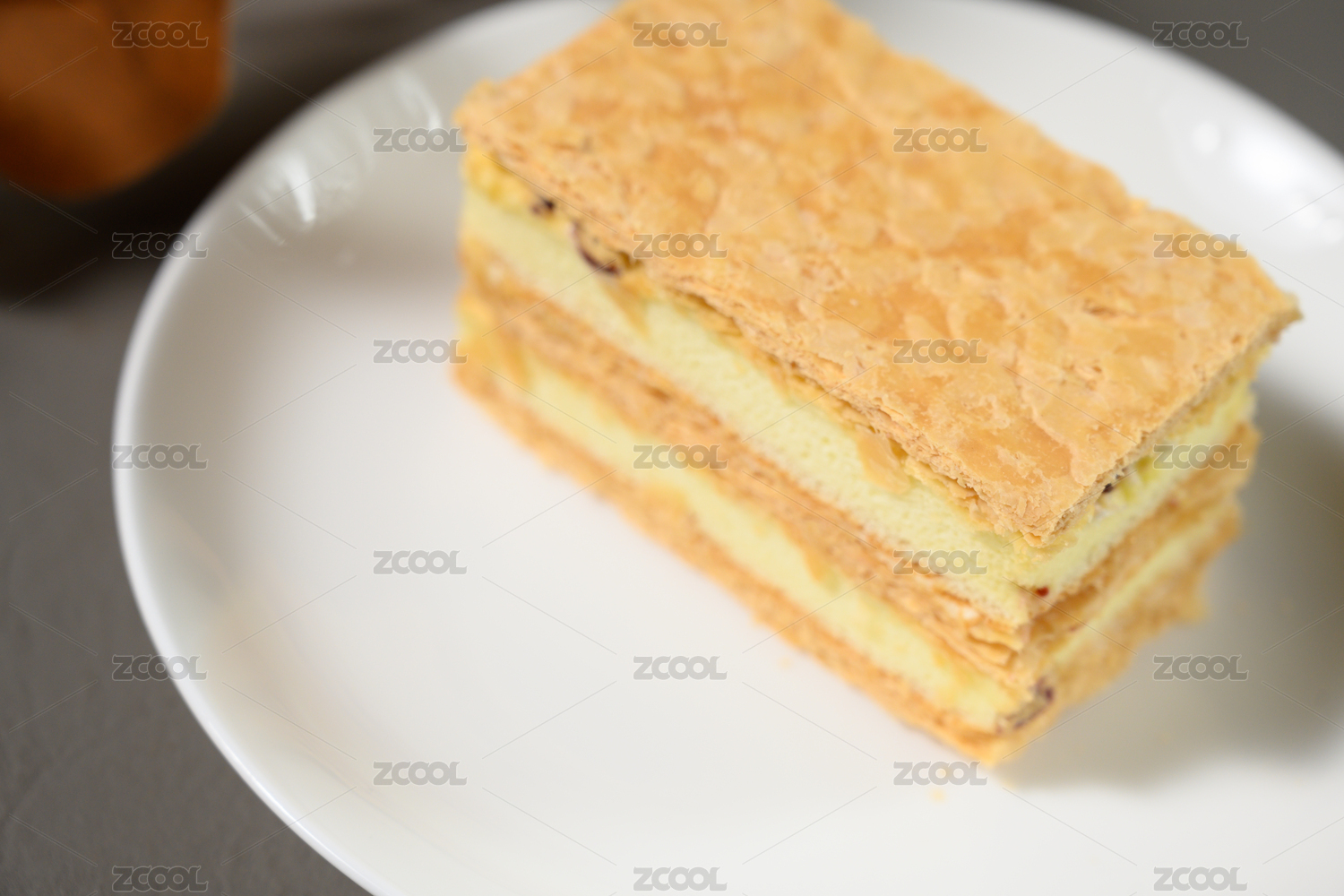 桌面上的盘子里的美味可口的拿破仑蛋糕