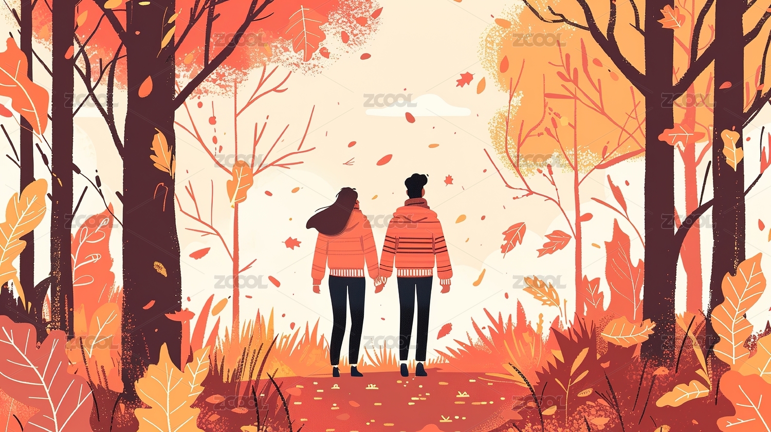 初秋秋天唯美情侣橙黄扁平渐变插画