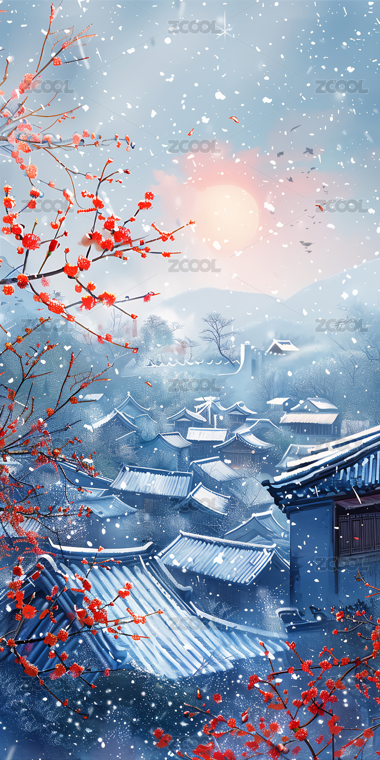 艺术, 红色, 水彩, 白色, 唯美, 绘画, 冬天, 红梅, 房屋, 冬日