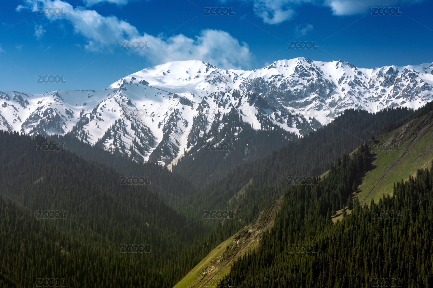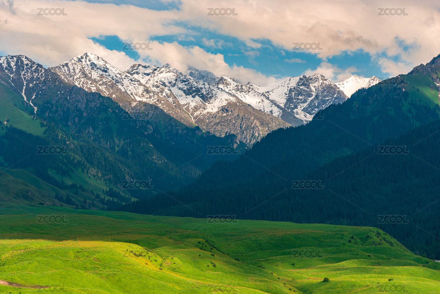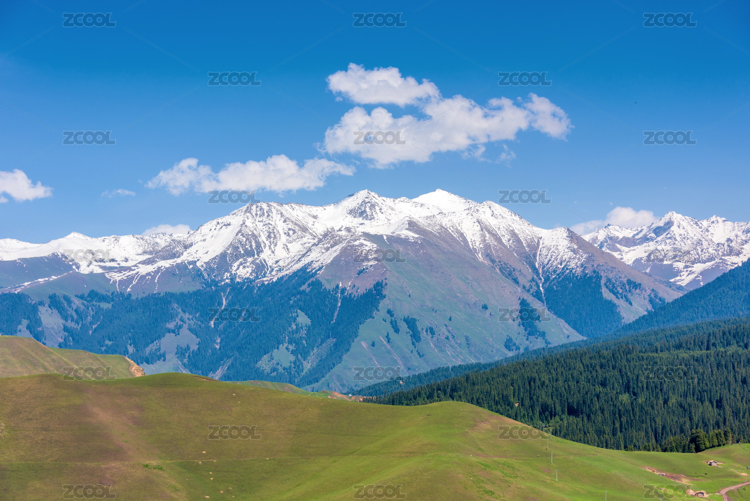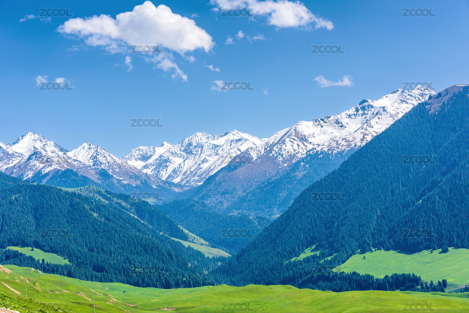 中国新疆果子沟大桥边的雪山草地