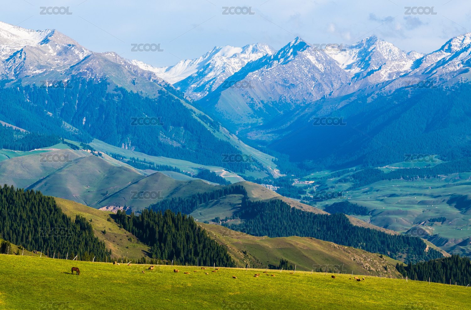 中国新疆乌孙古道高山牧场与远处的雪山