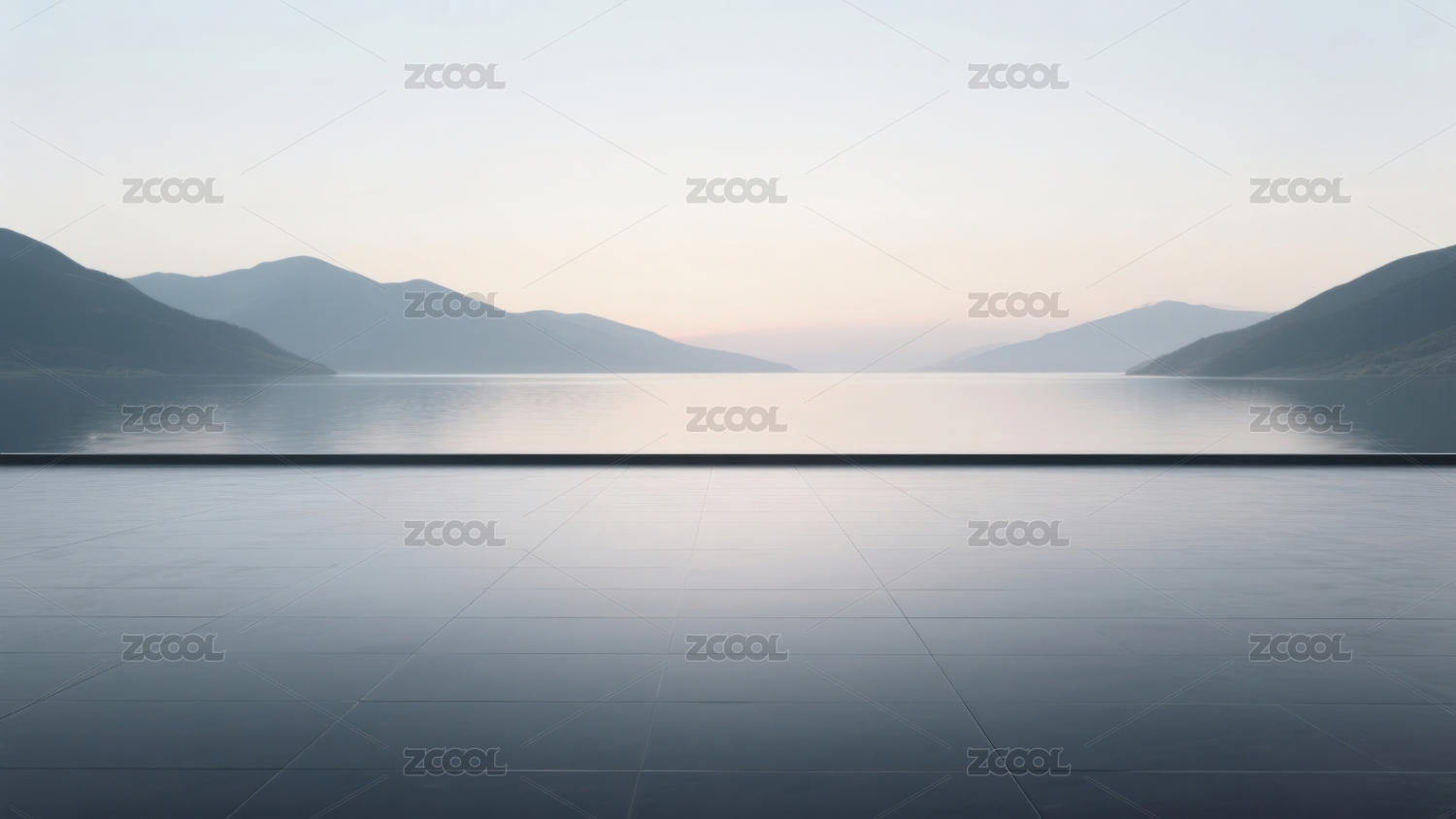广阔湖面映着阳光远处是连绵山脉与淡蓝天际