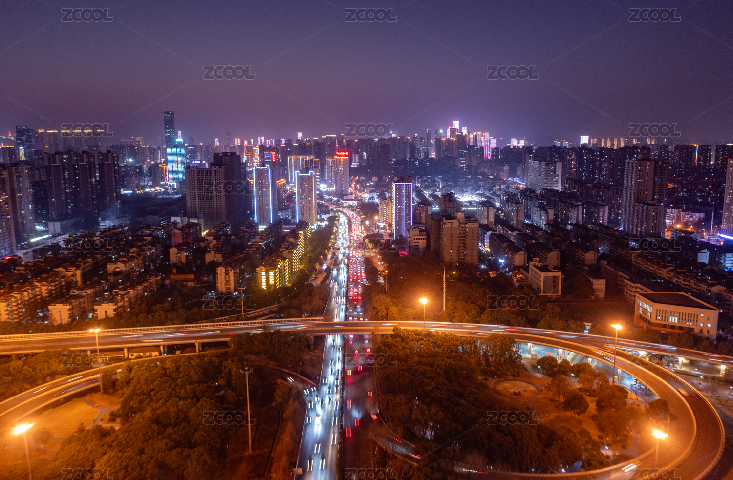 傍晚时分的城市立交桥夜景和繁忙的车流
