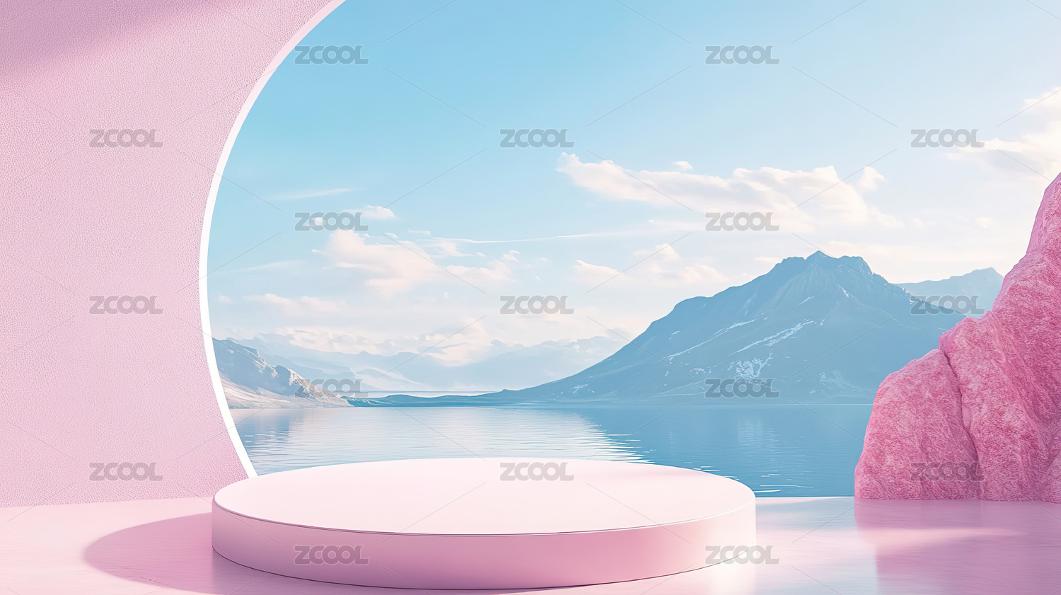 粉色山脉地形湖面与产品展台背景