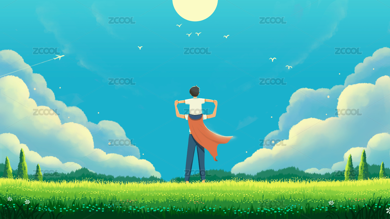 父亲节,父亲,儿子,插画,3D,天空,草地,背影,亲子