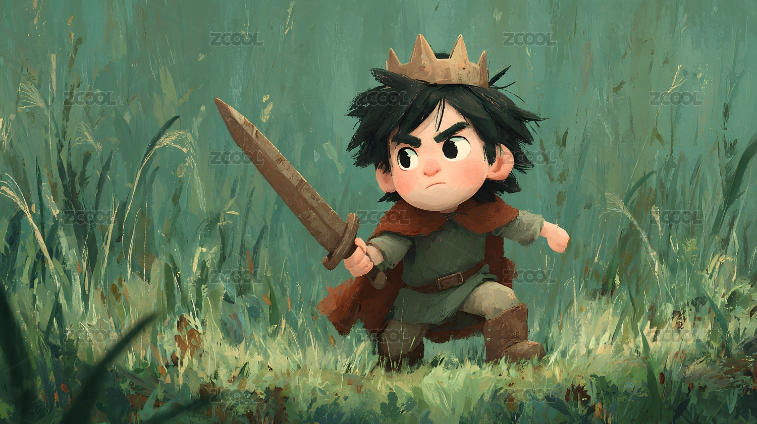 戴皇冠的小王子持剑行走 绿色草地中