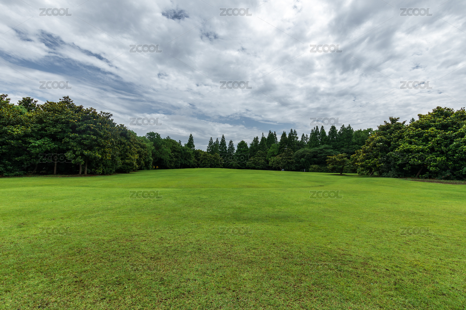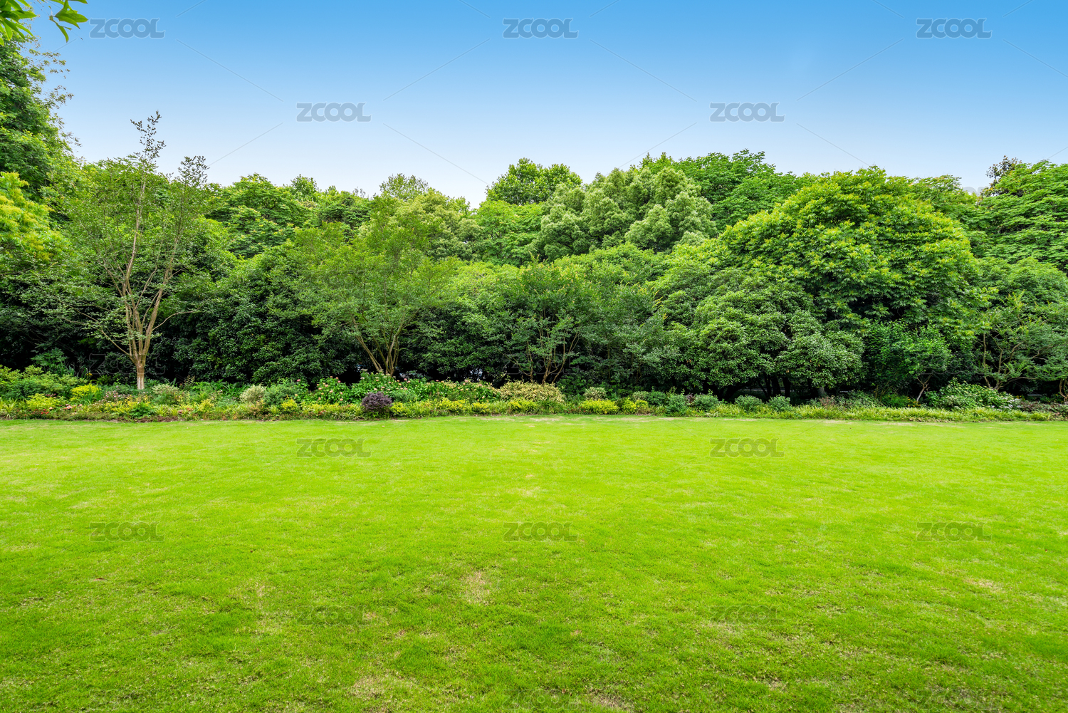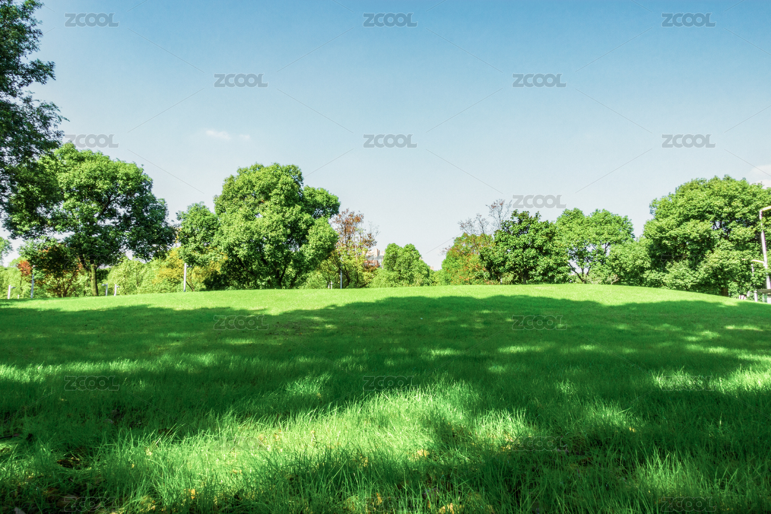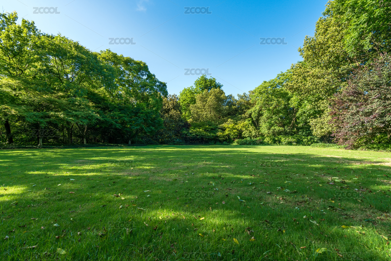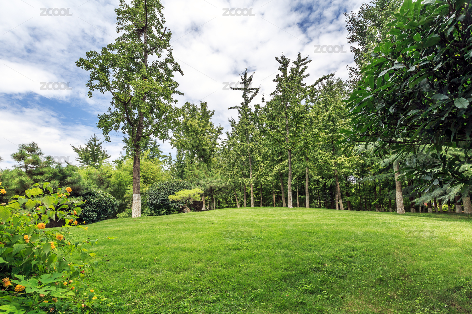 中国山东省济南市五龙潭公园内的阳光绿树草坪自然风光
