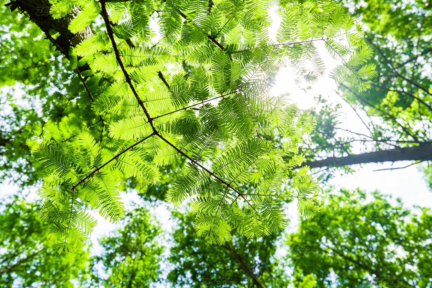 阳光透过水杉的清新画面