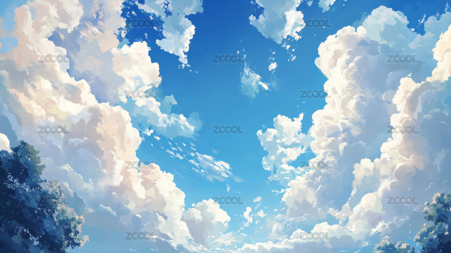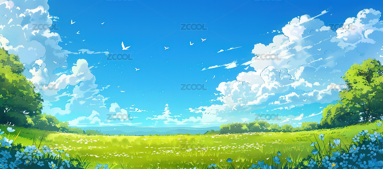 蓝天白云草地绿色大树插画风景壁纸
