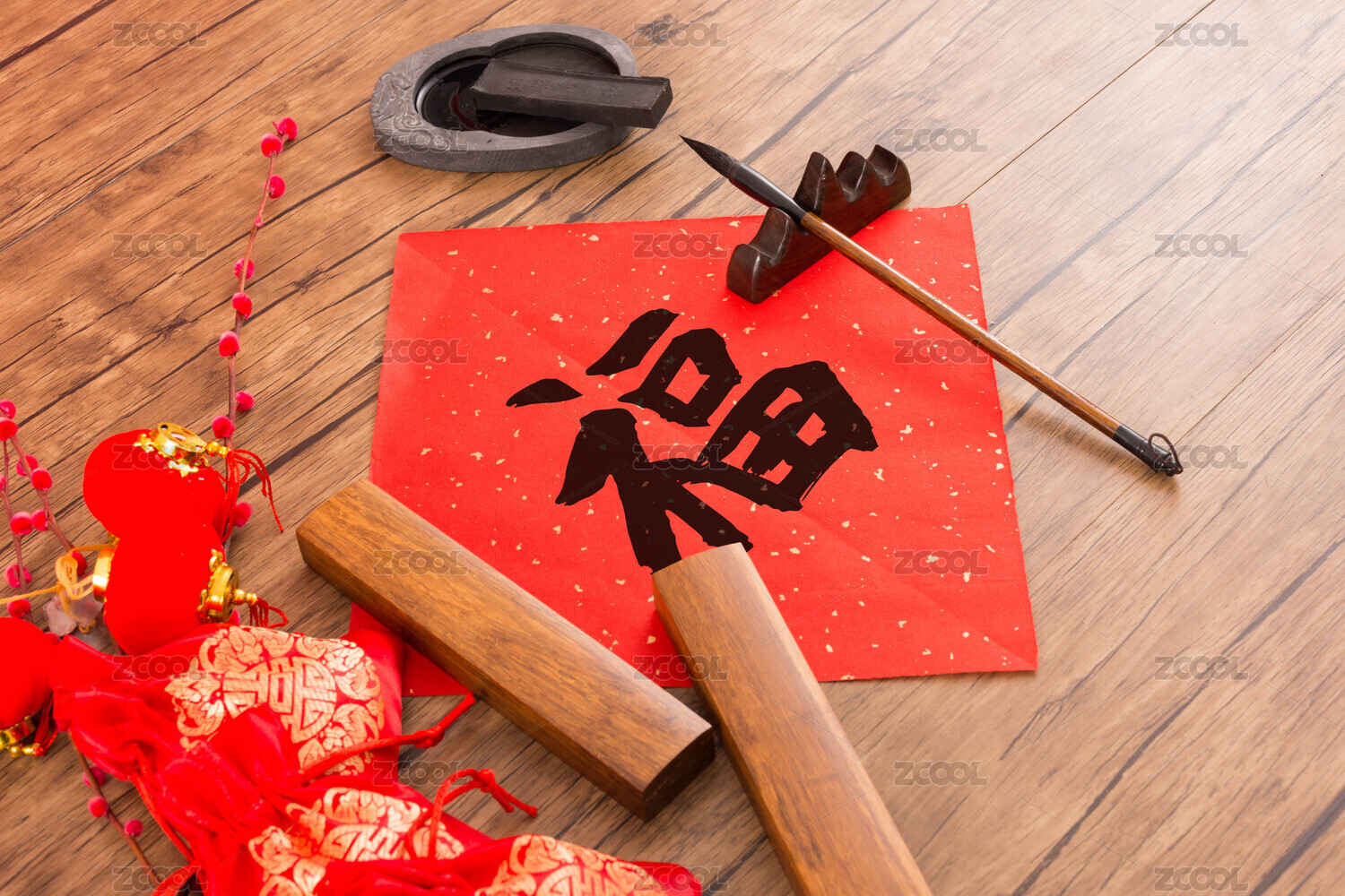 春节福字与毛笔摆放在木桌面上特写
