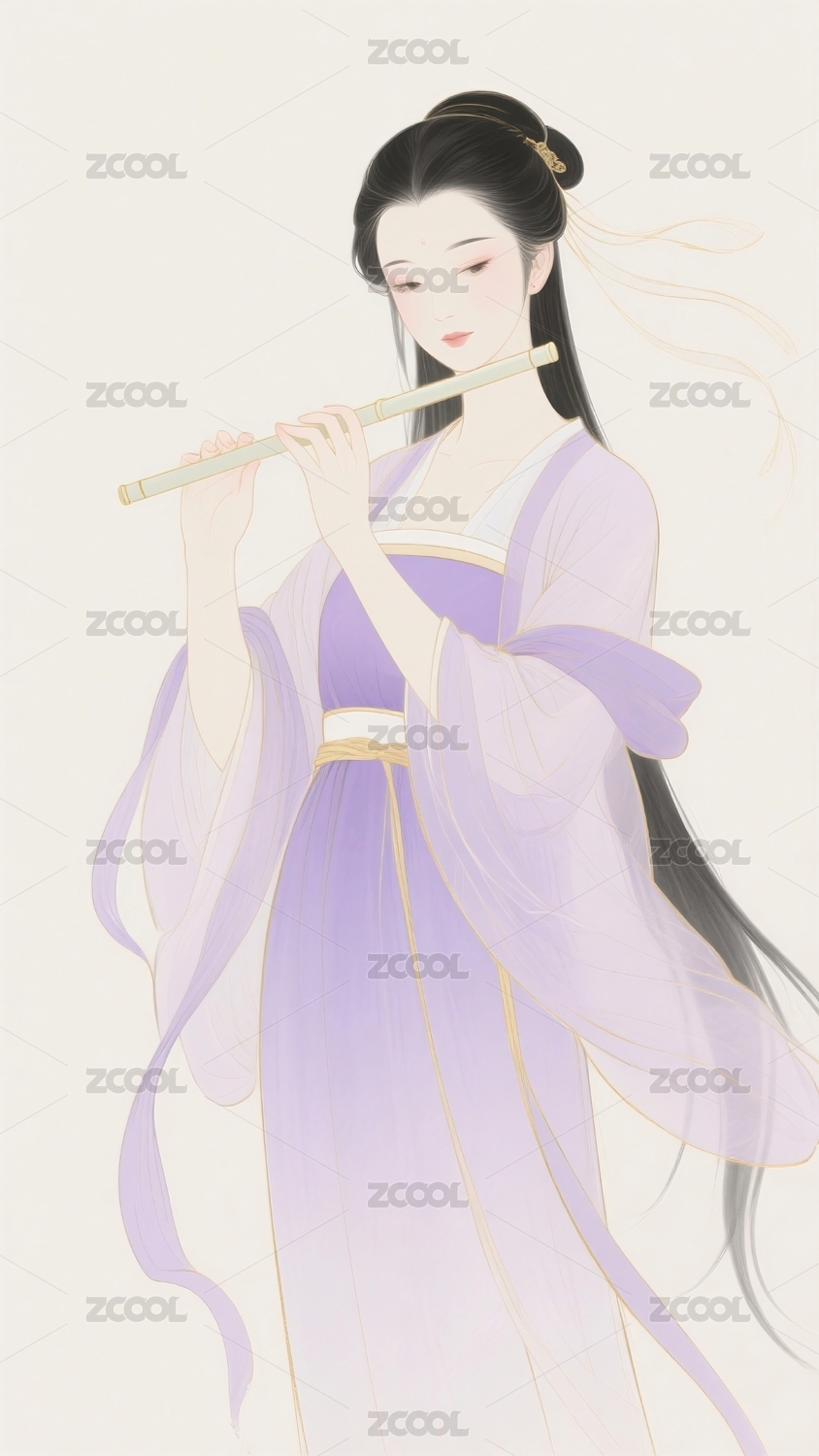 女子吹笛身着淡紫衣衫姿态优雅