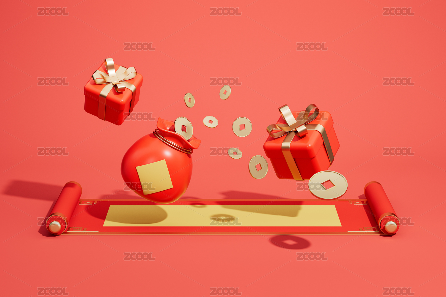 放在红色卷轴上的装满元宝金币的福袋锦囊