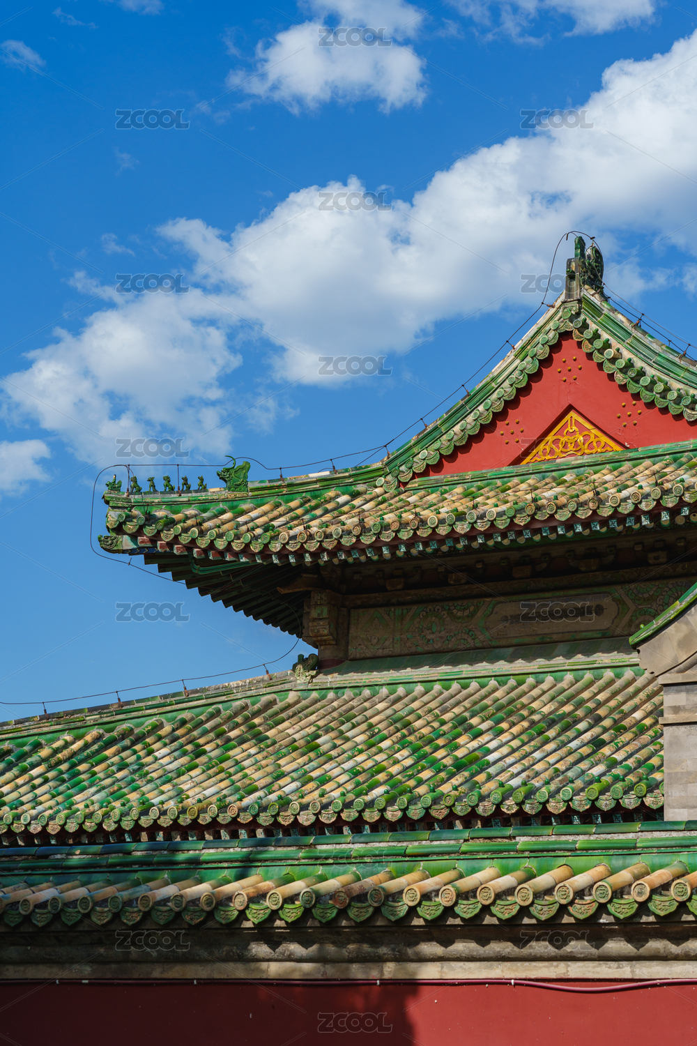 蓝天下的北京中山公园宰牲亭屋顶房檐特写