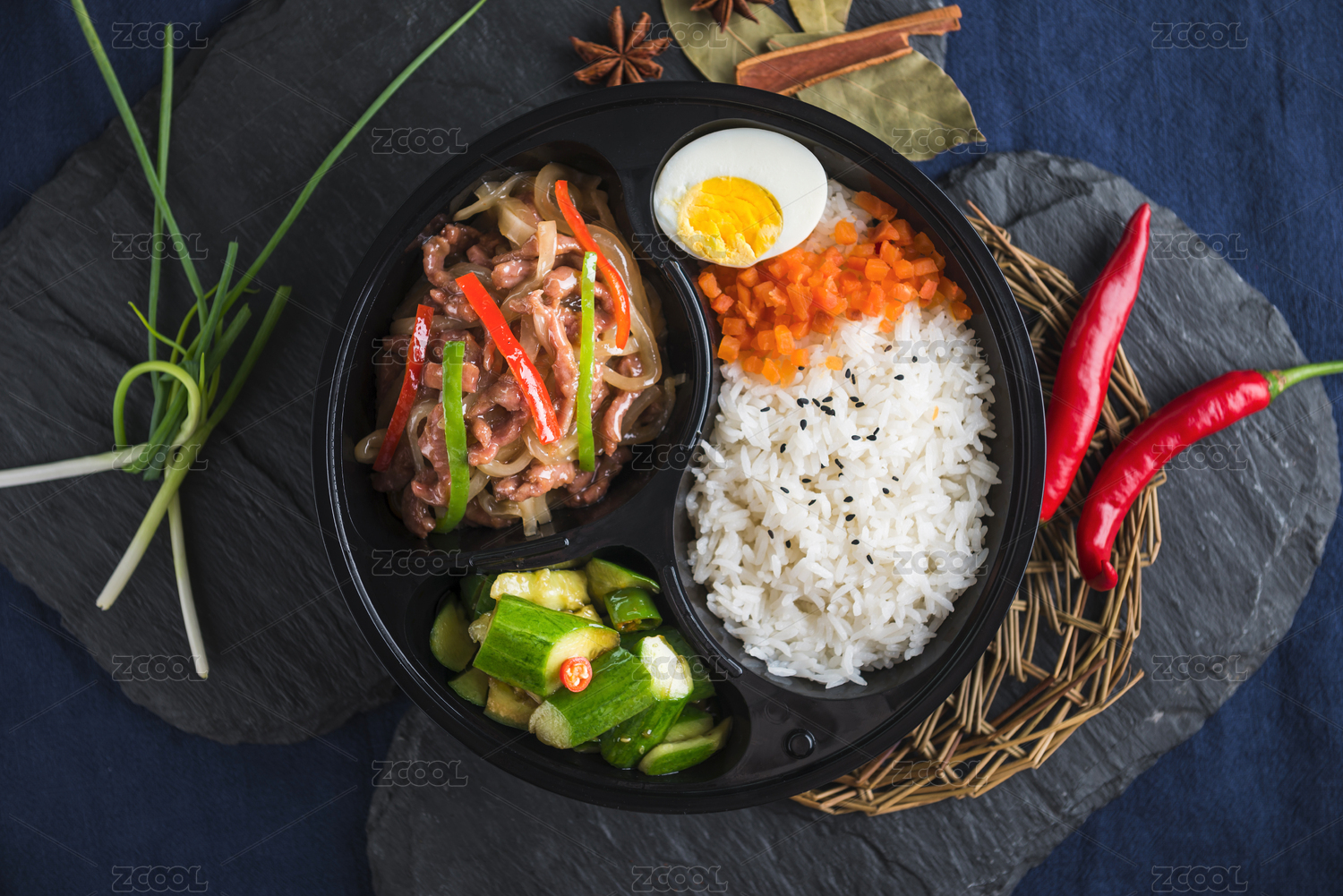 搭配凉拌黄瓜和煮鸡蛋的榨菜肉丝中式套餐