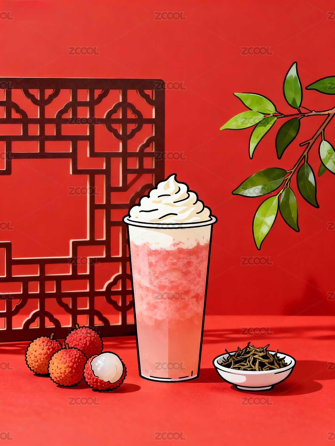 饮品奶盖搭配荔枝茶叶