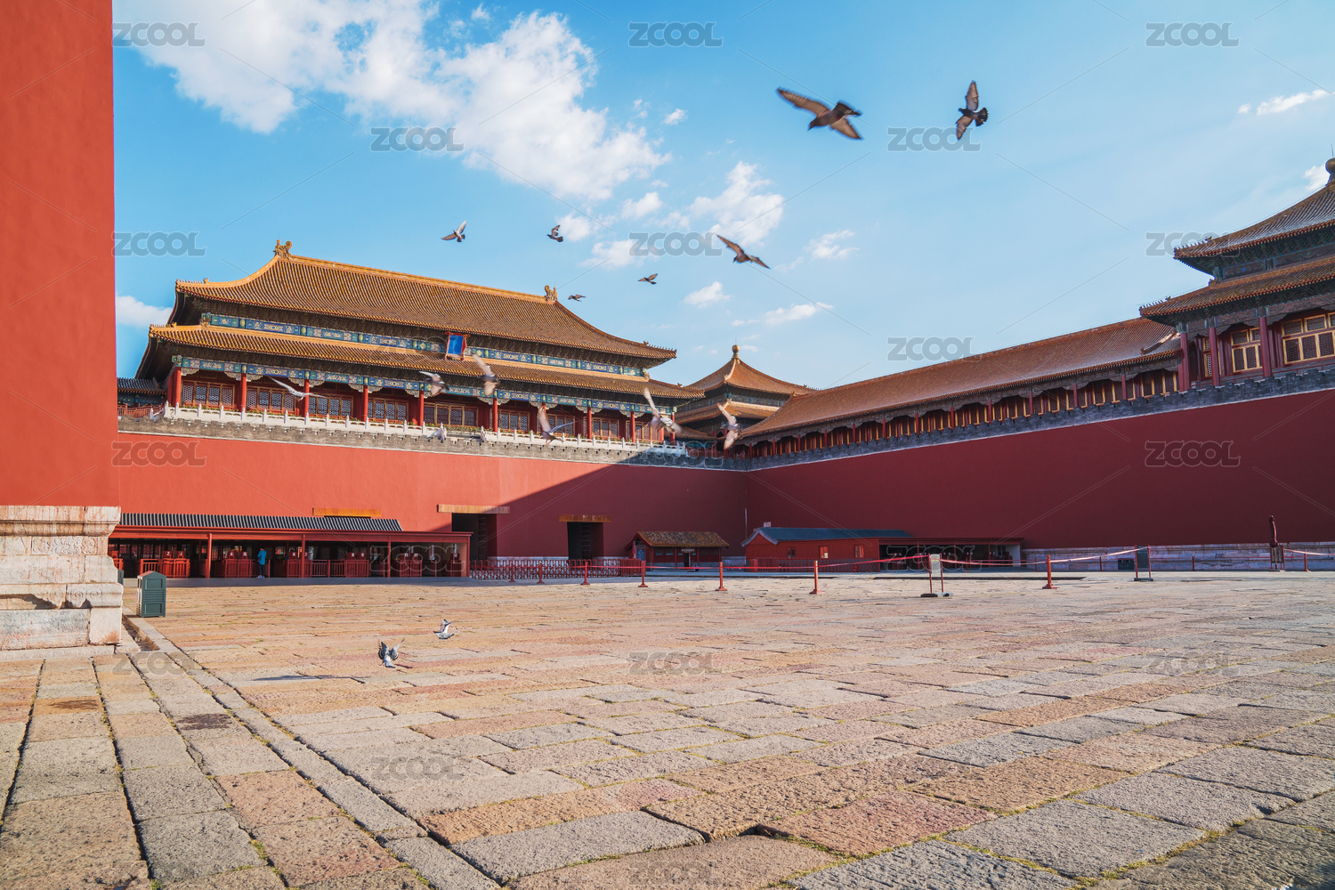 中国北京故宫的鸽子午门前的鸽子展翅飞翔