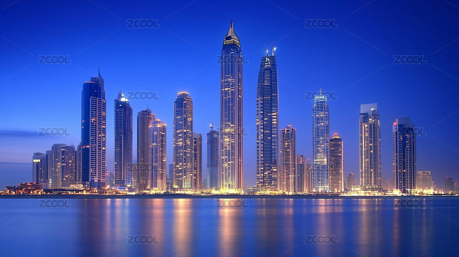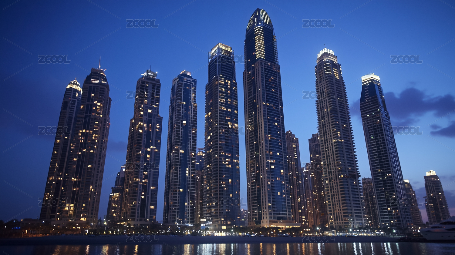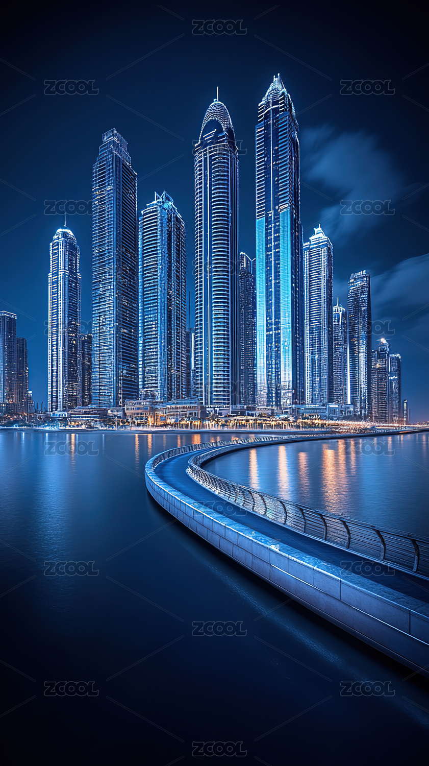 迪拜夜晚的摩天大楼建筑群