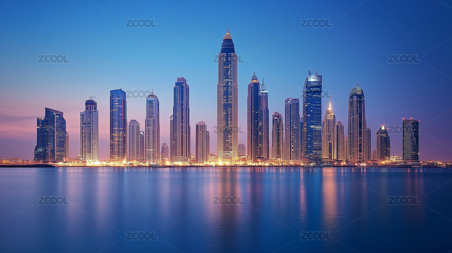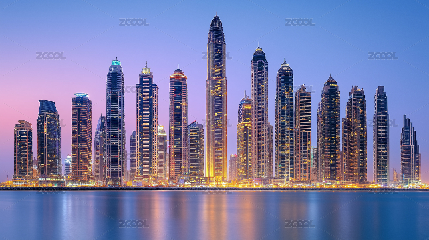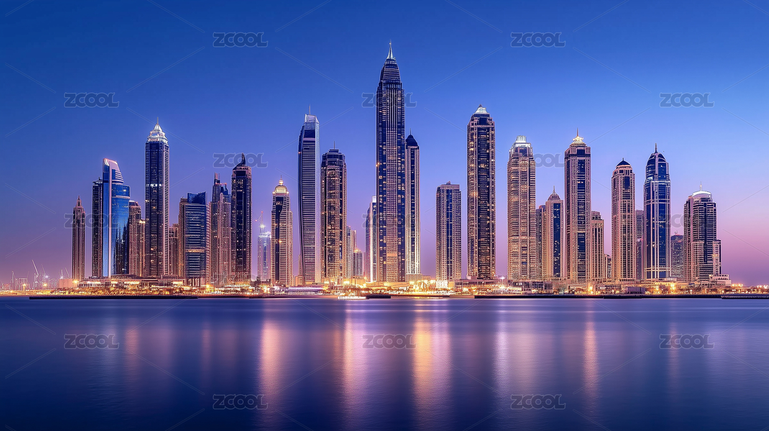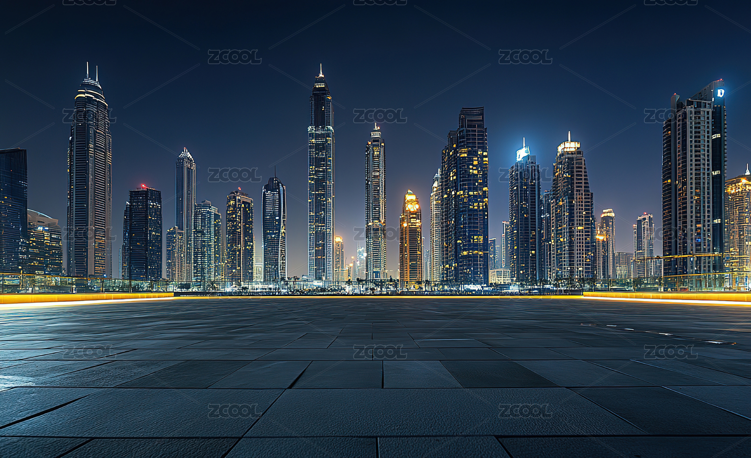 迪拜夜晚的摩天大楼建筑群