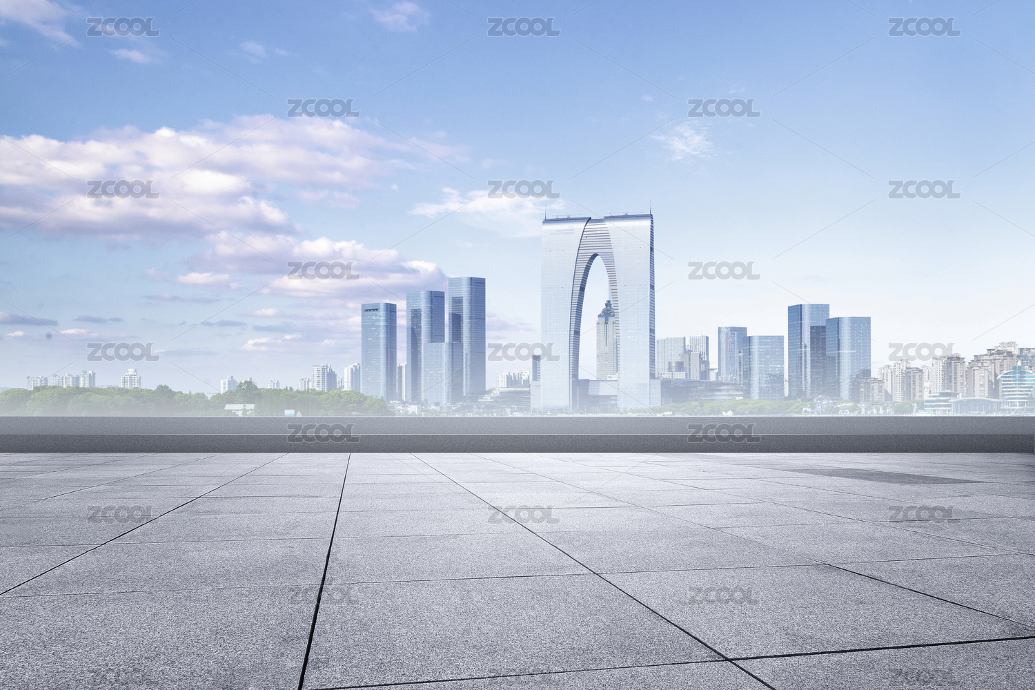 以苏州现代城市建筑为背景的空旷的柏油路面