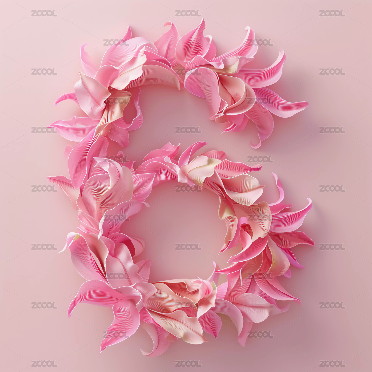 粉色的鲜花花瓣拼出来的英文字母O或数字0