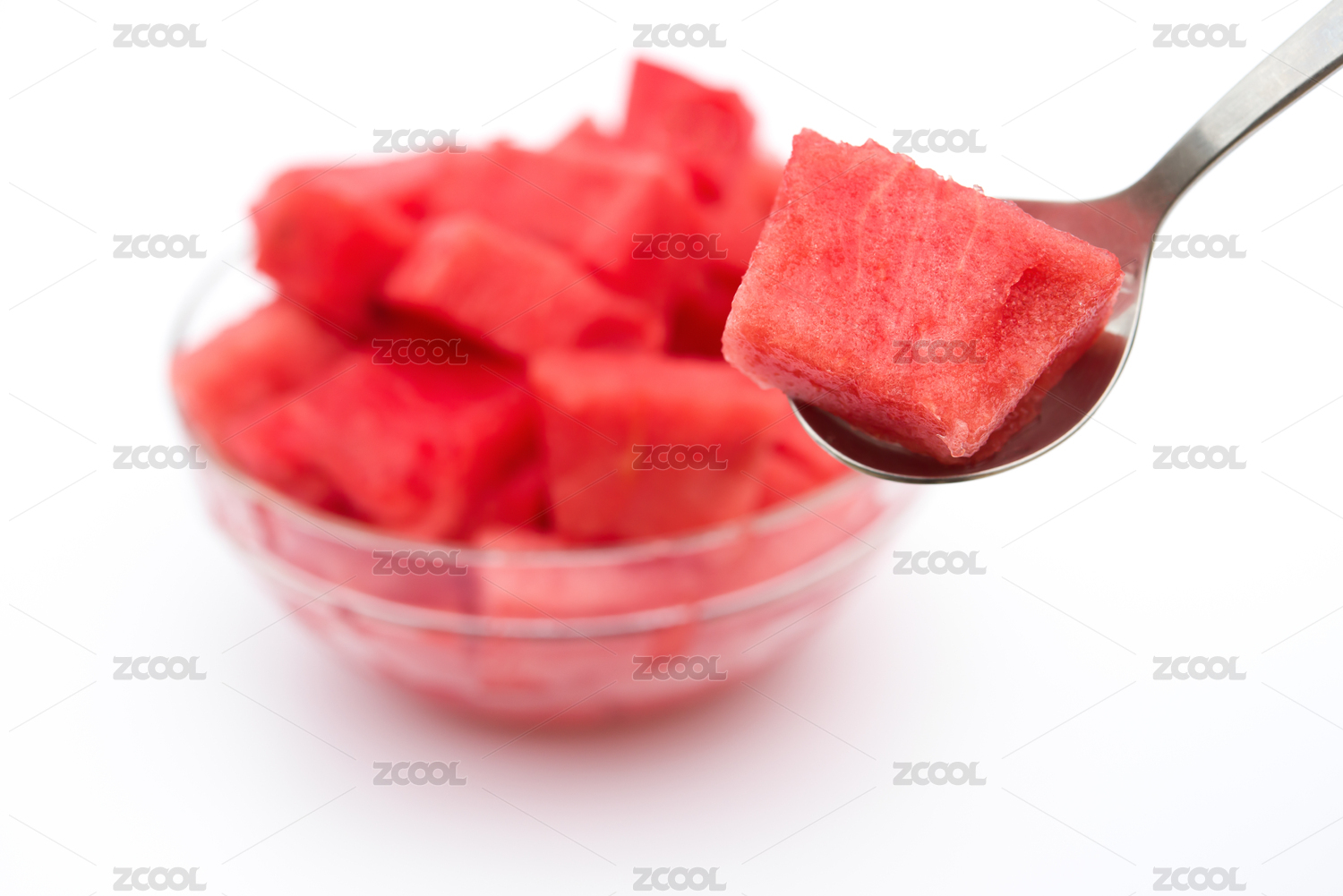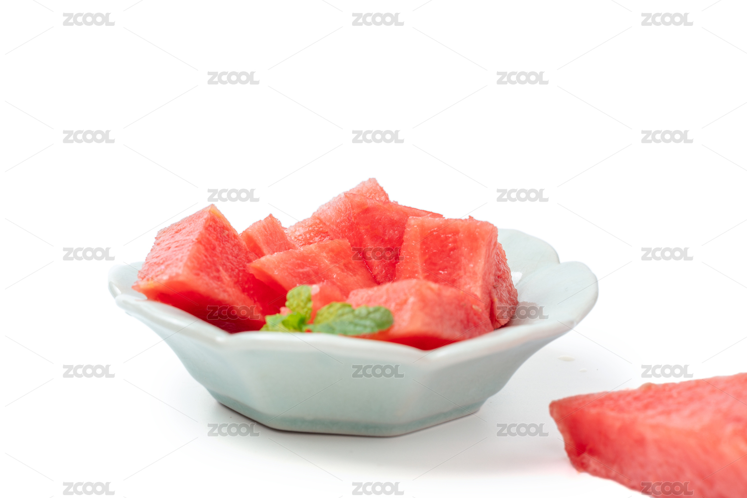 白色桌面上的一碟子切块的新鲜夏日水果西瓜