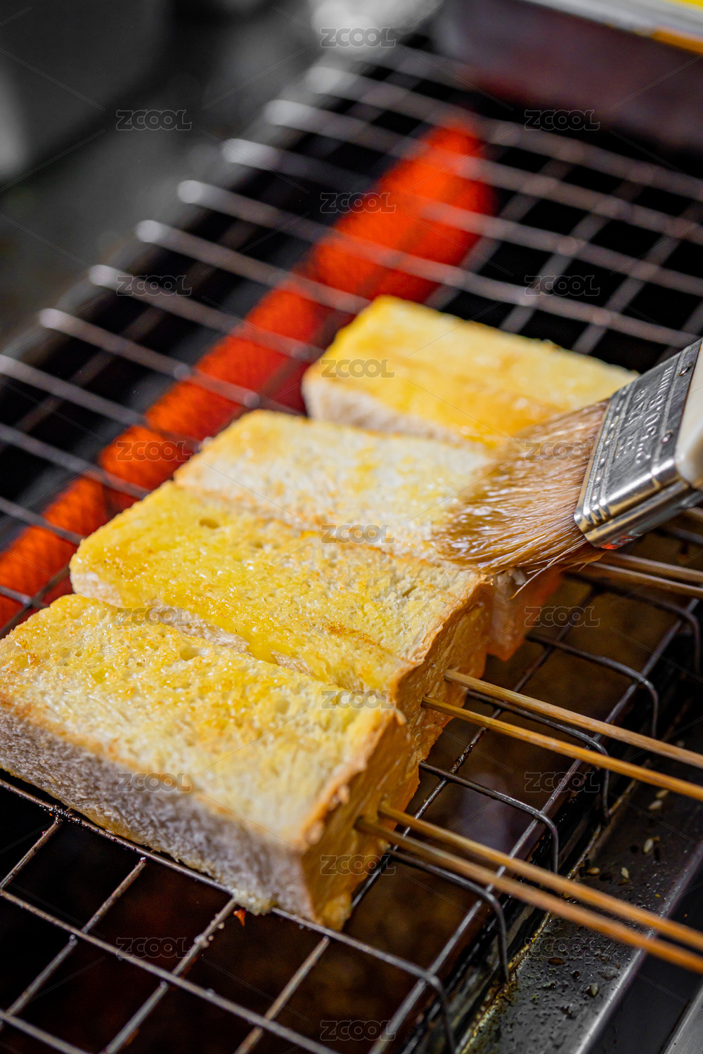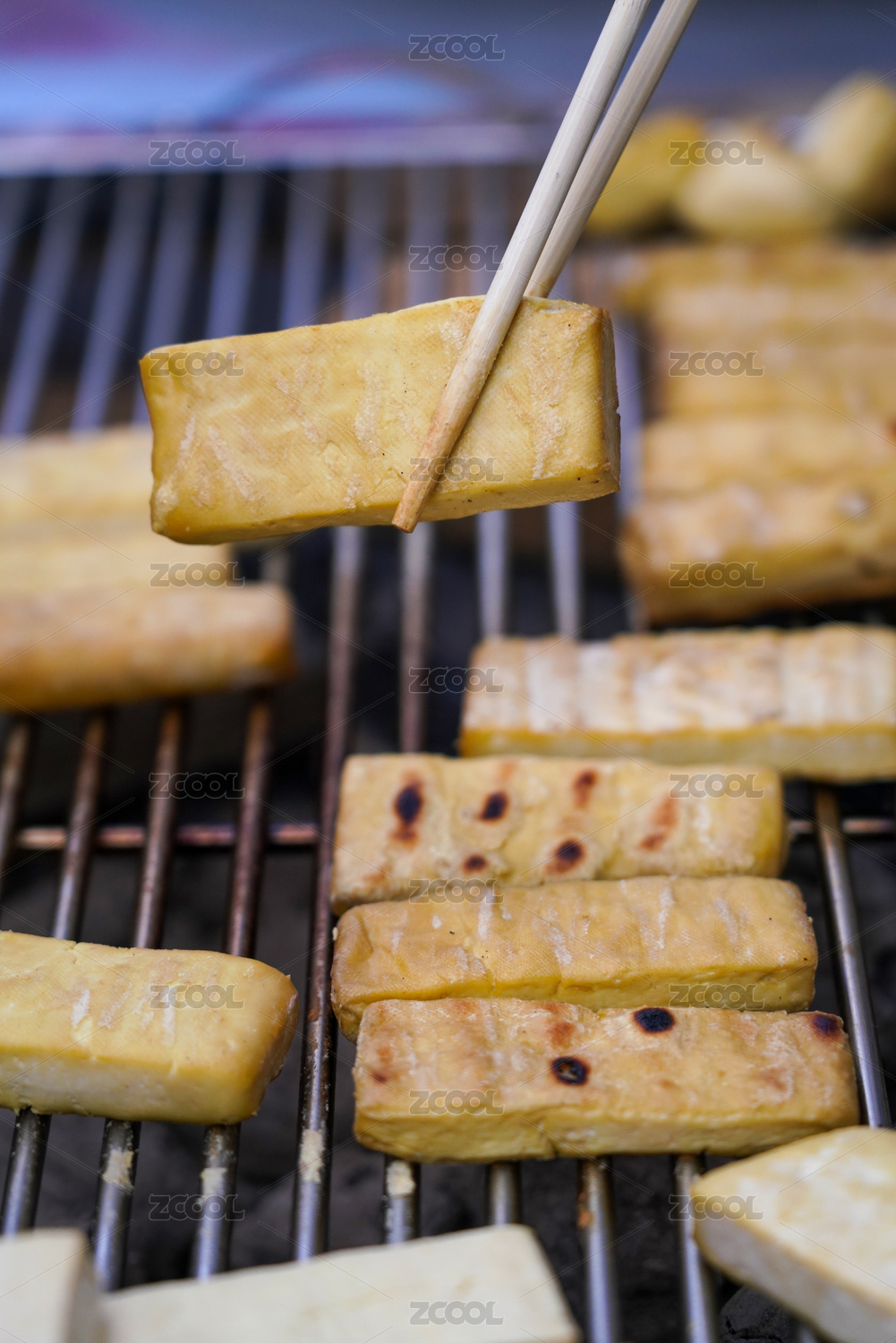 黑色烤架上放着几串撒着辣椒面的油炸豆皮