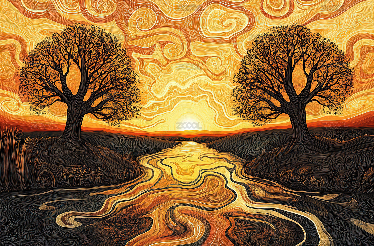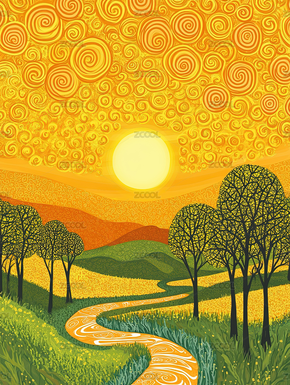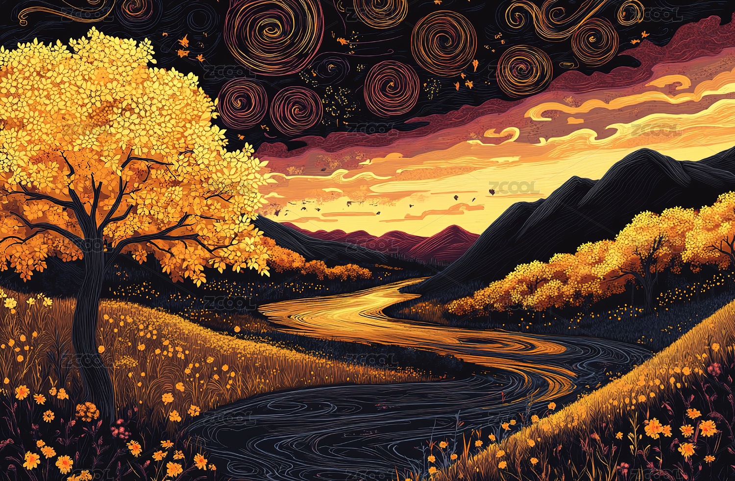 黄昏野外树林森林印象派抽象插画