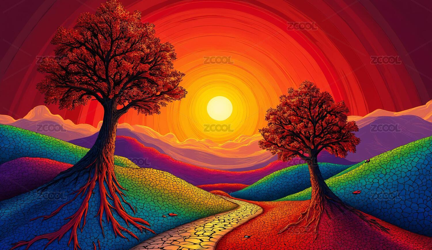 彩虹山丘上的两棵大树