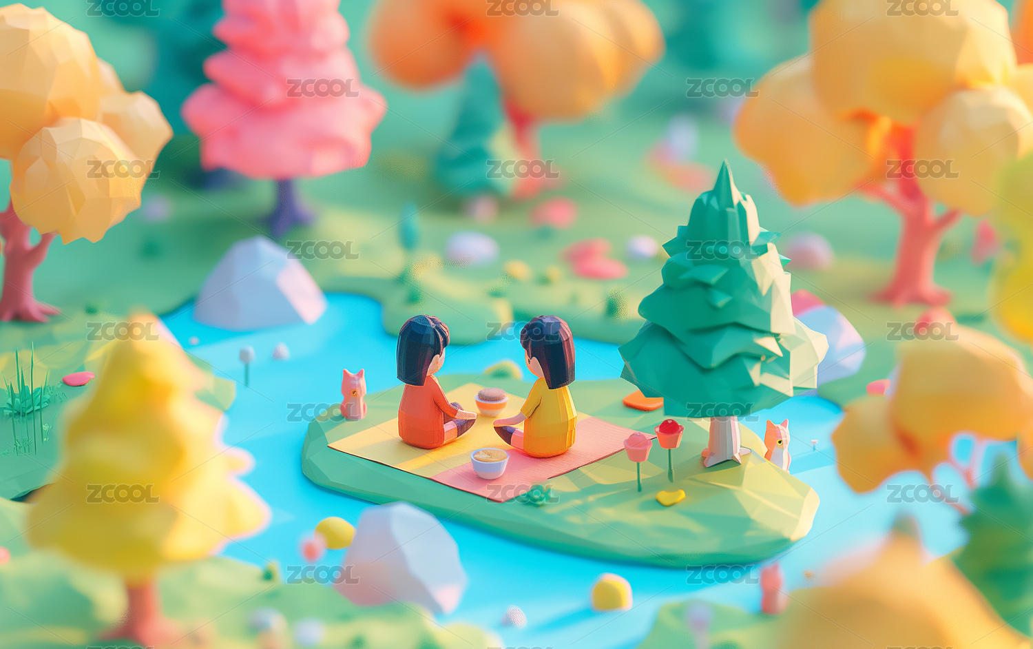 微缩创意剪纸溪水森林与露营休闲的人