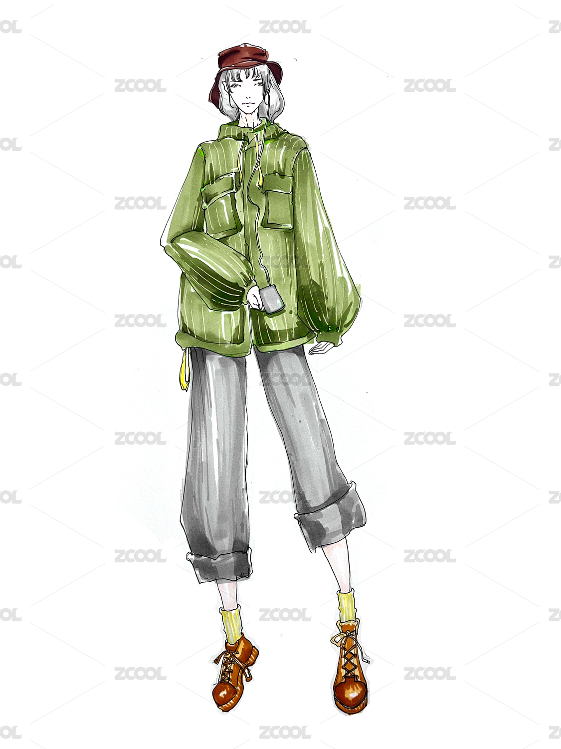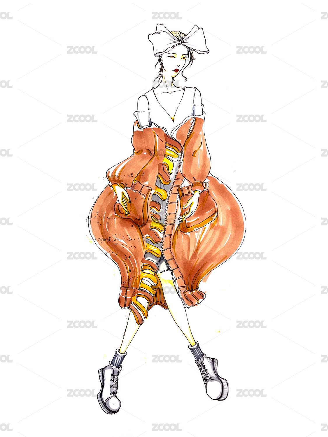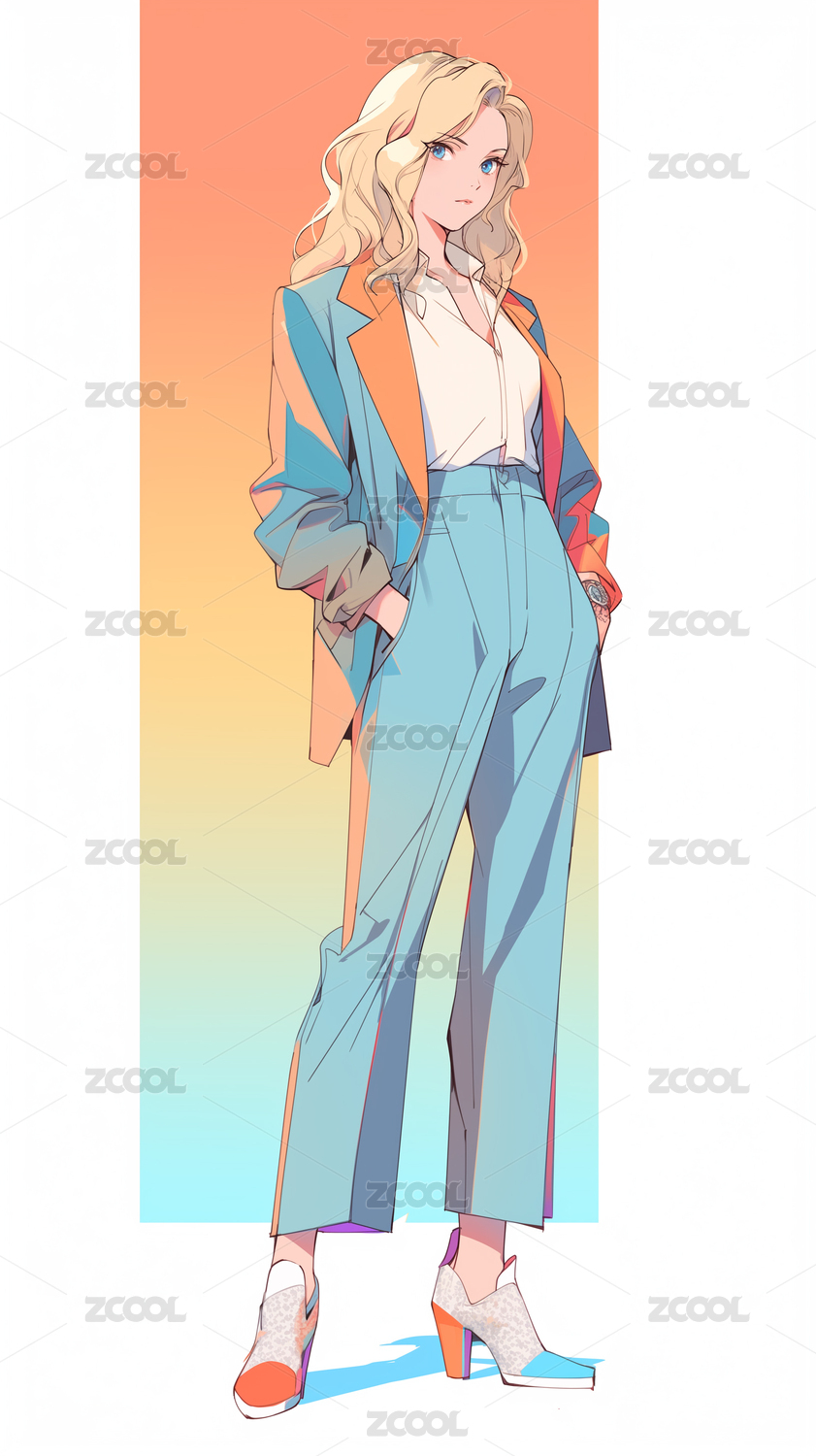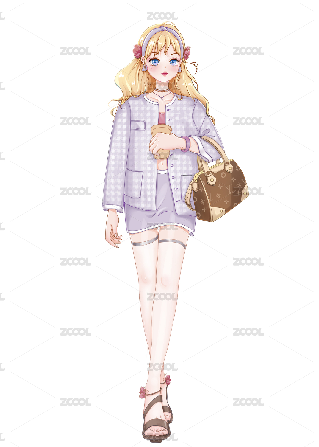 一个黄色头发穿黑色短裙花色衬衫的女孩正在街拍,夏日街拍插画