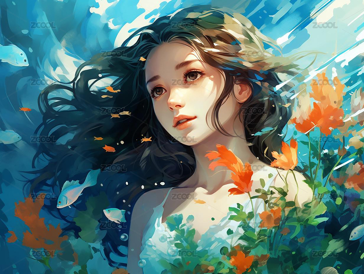 海洋,女孩,海底,梦幻,唯美,光影,发光,蓝