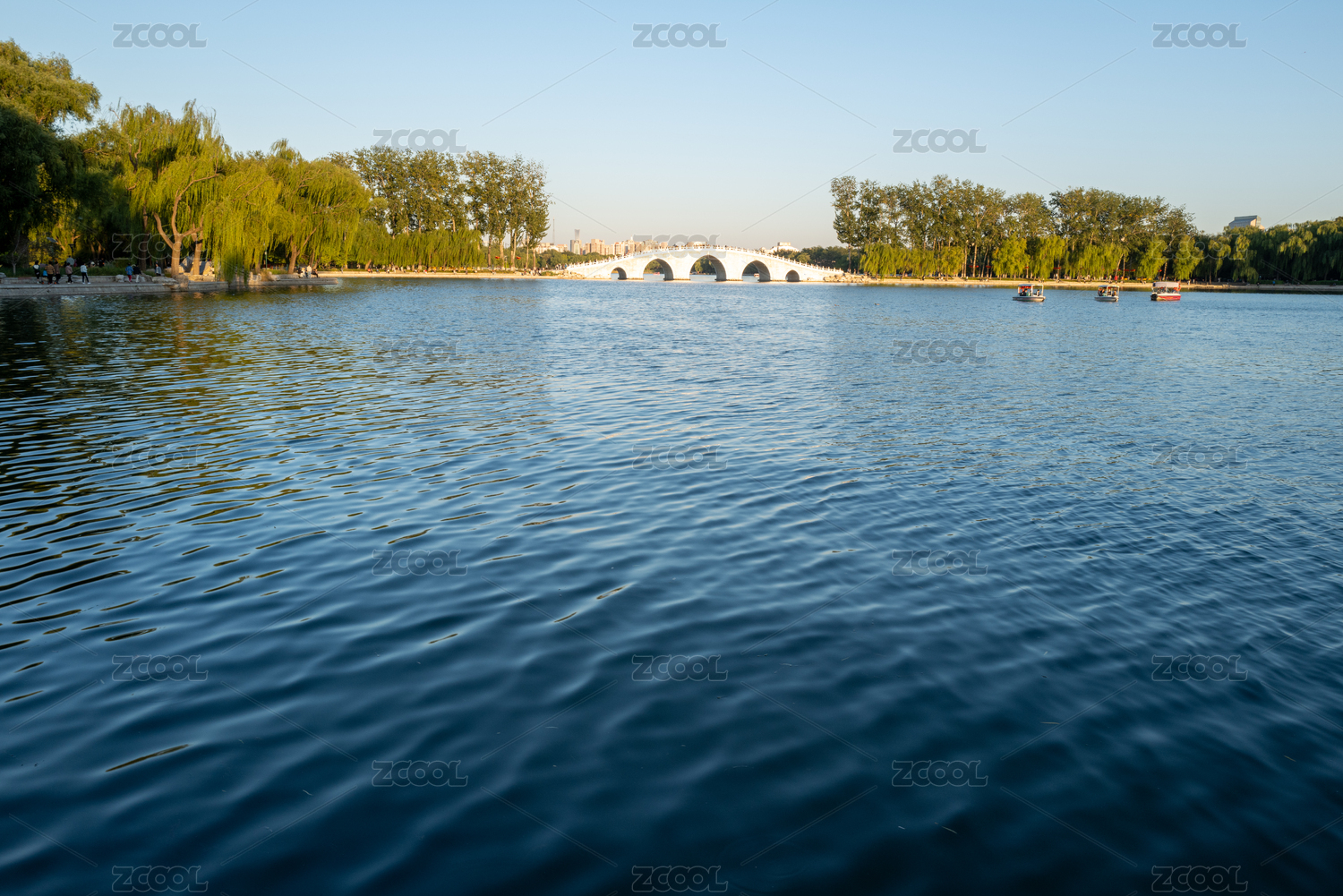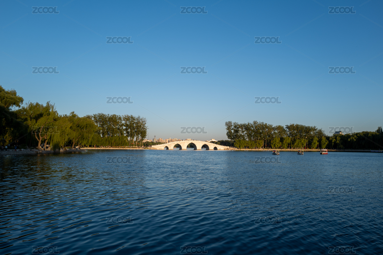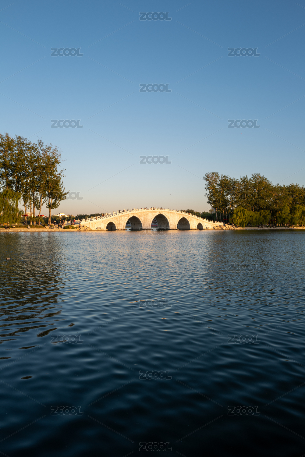 秋天夕阳下的北京颐和园公园的昆明湖十七孔桥