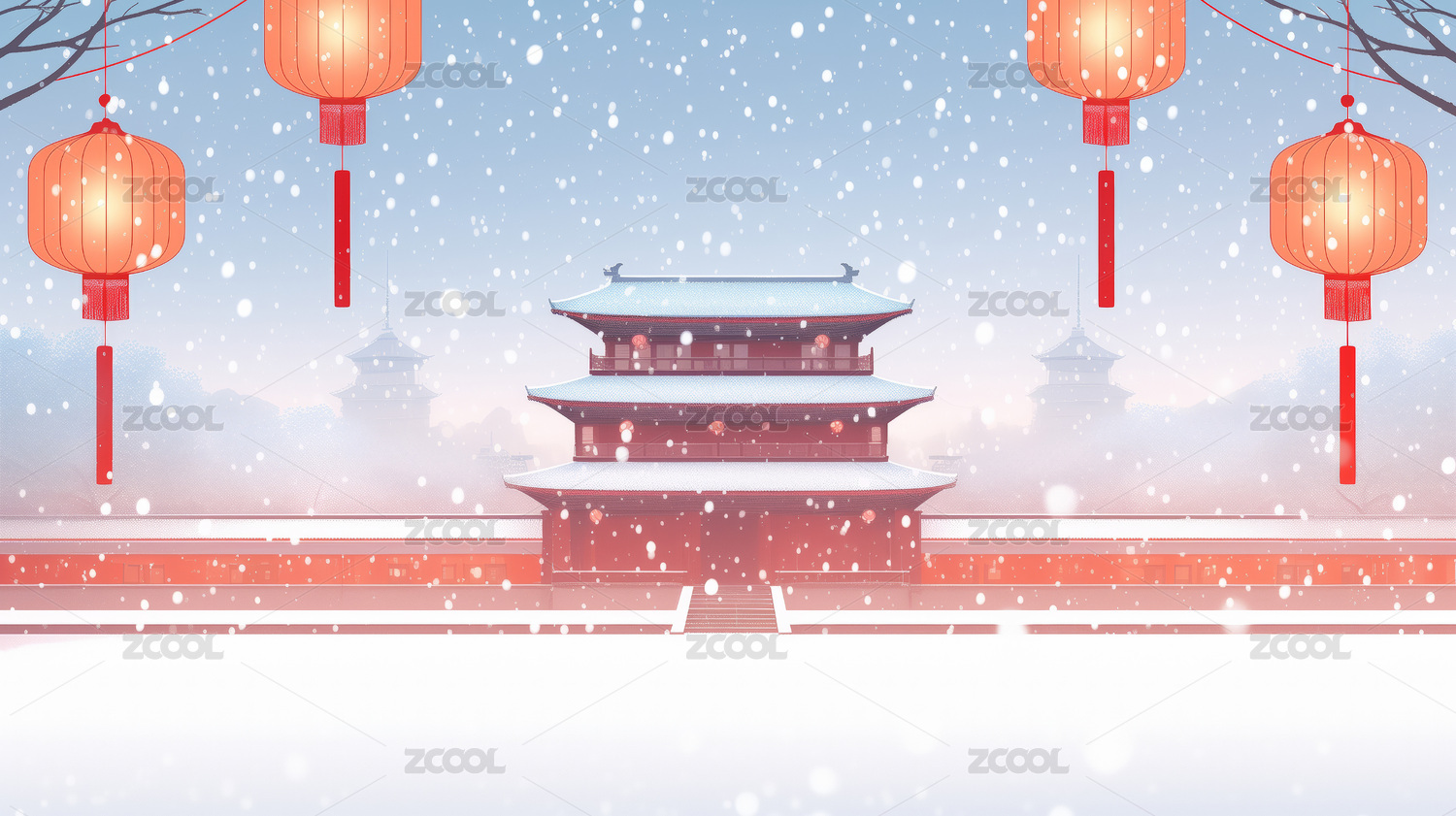 红色古建筑宫殿墙壁柿子树下雪雪景插画背景