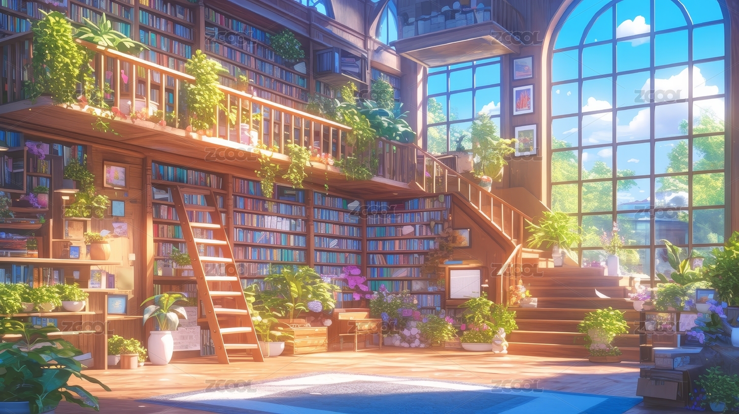 紫色浪漫印象派书店图书馆壁纸装饰画