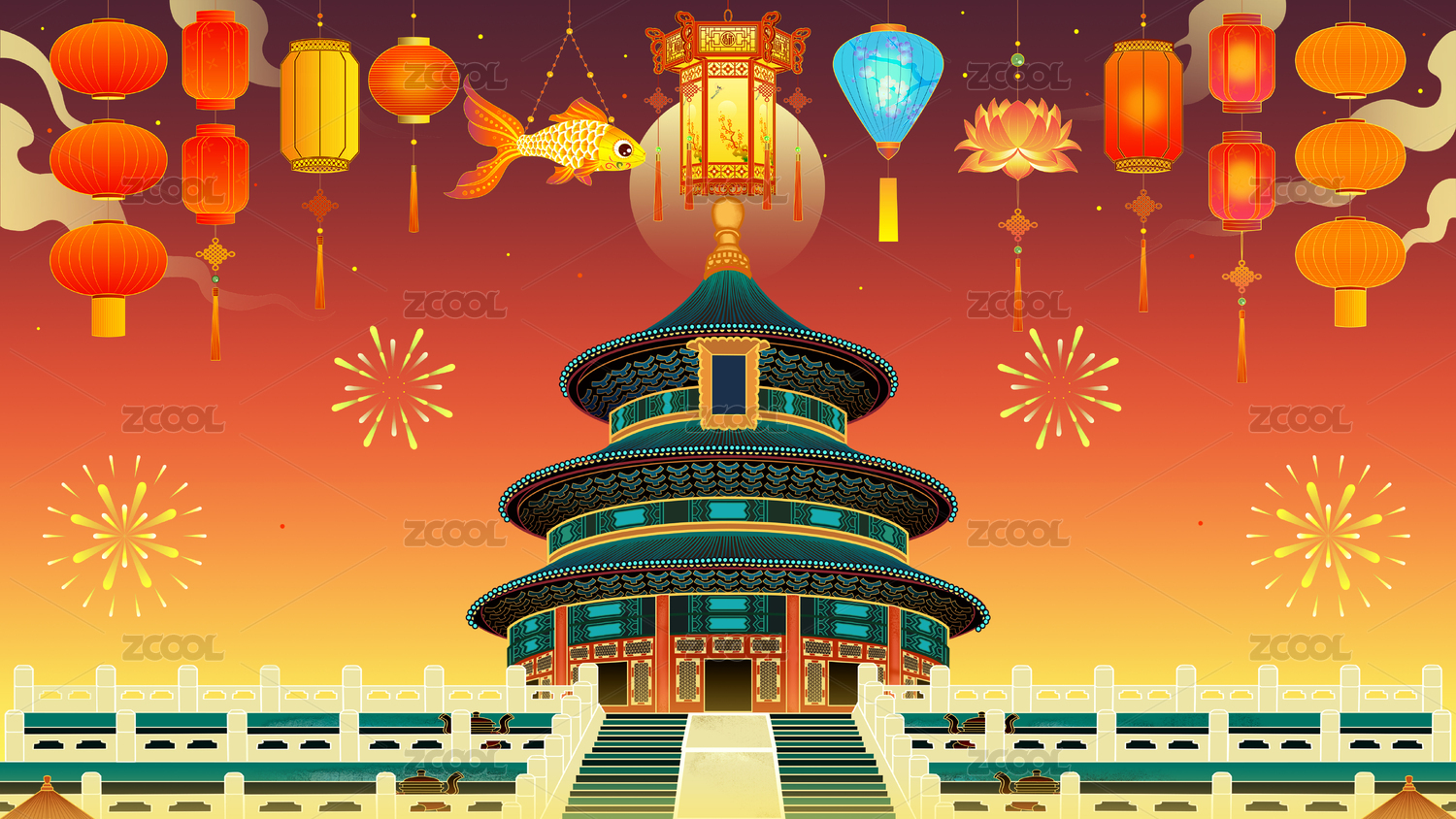 传统喜庆节日元宵节灯笼北京天坛矢量插画