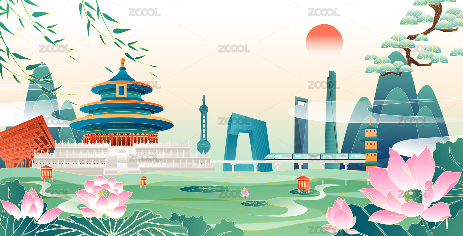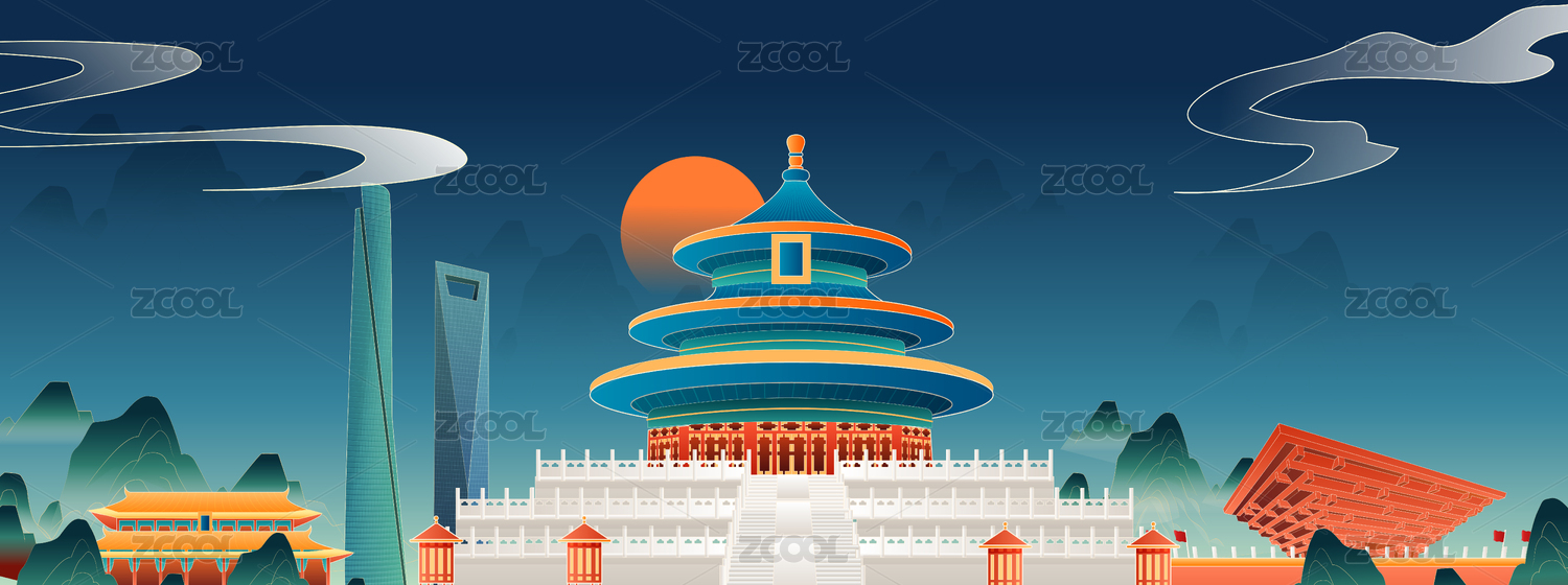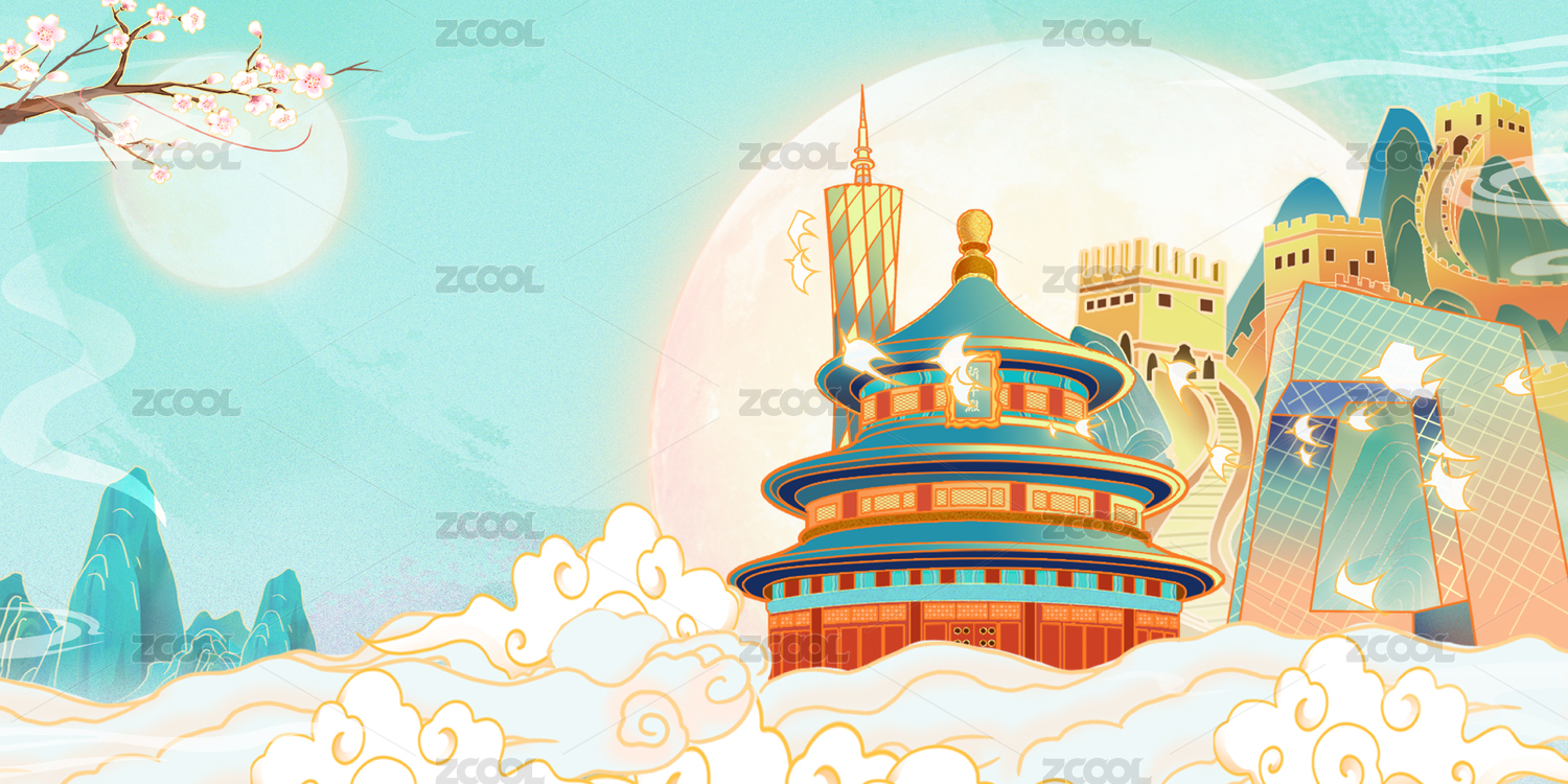 中秋国庆双节同庆国潮城市古建筑节日插画