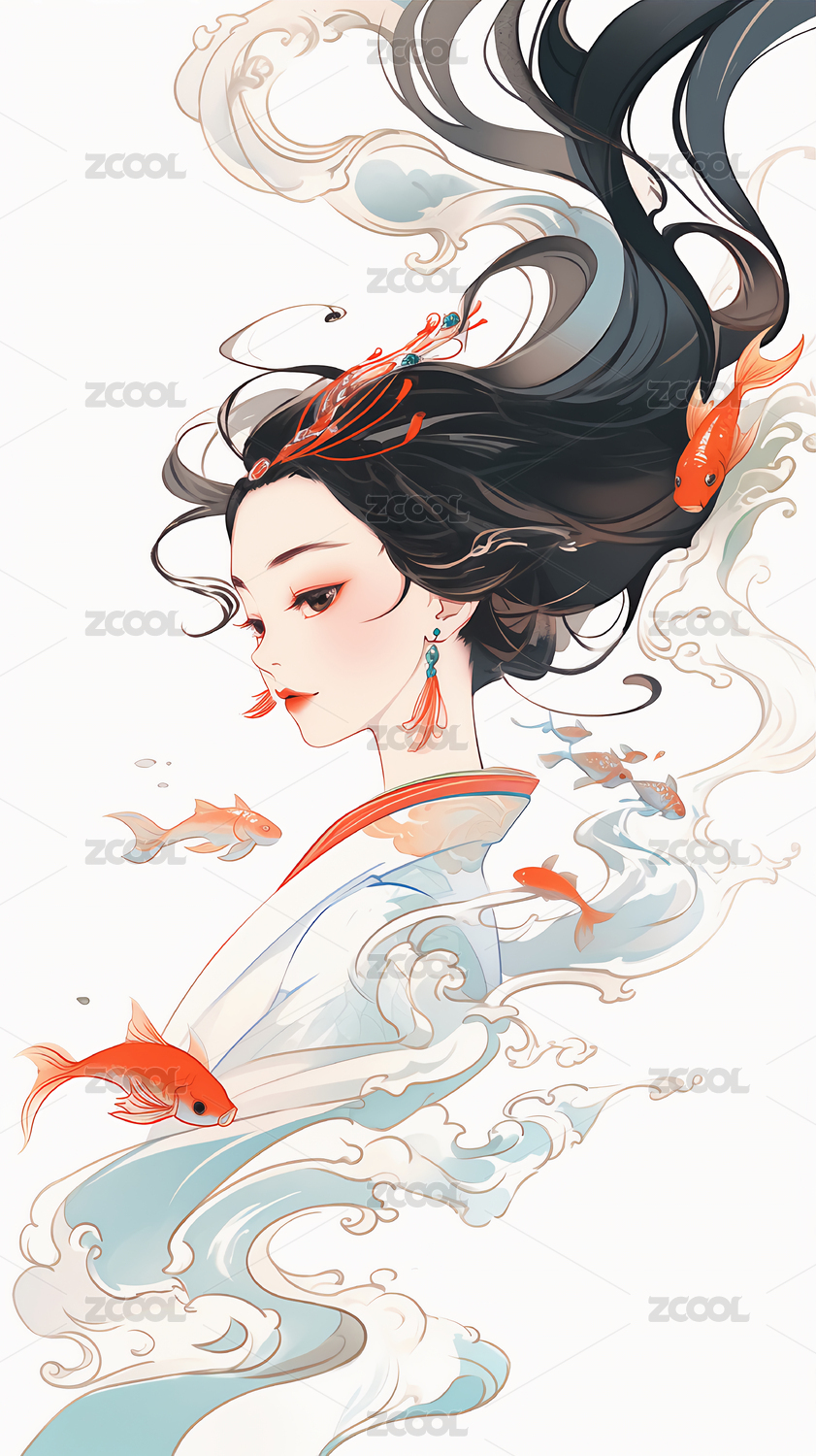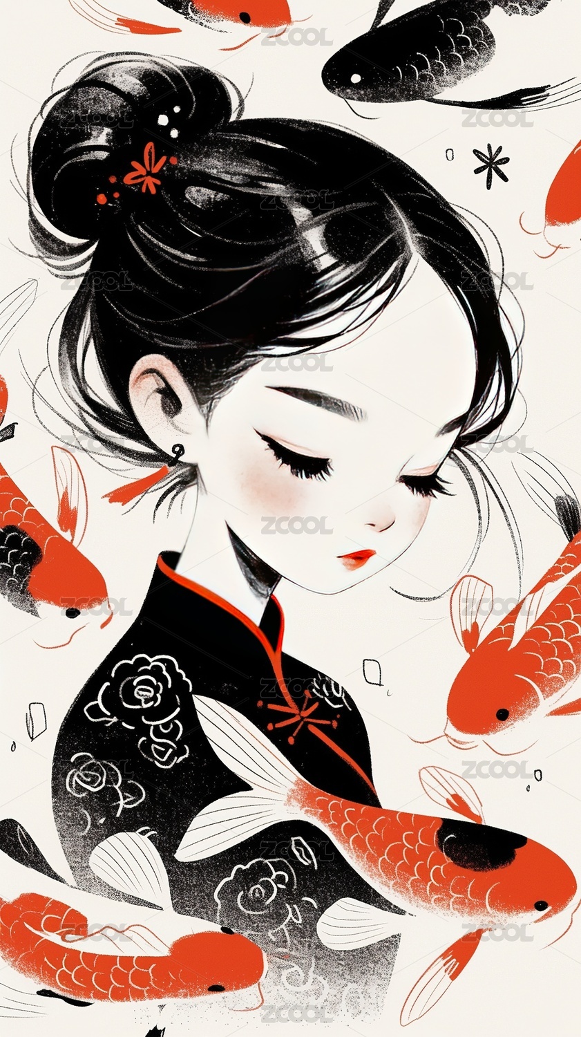 女人,美女,汉服,国风,肖像,鲤鱼,锦鲤,旗袍,女孩