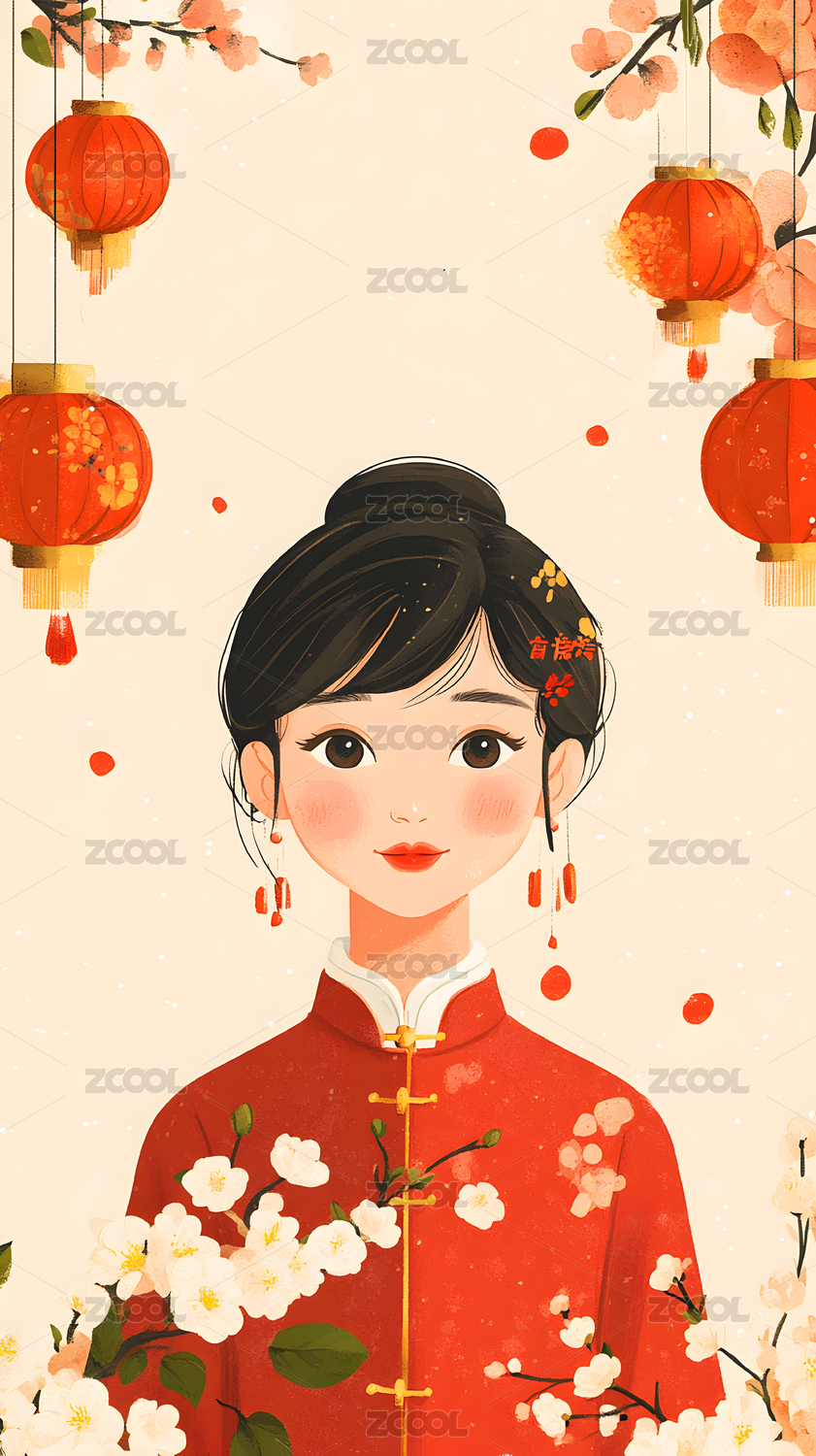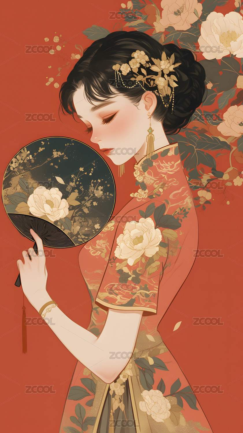 一个拿着扇子的旗袍美女和花窗花瓶梅花燕子