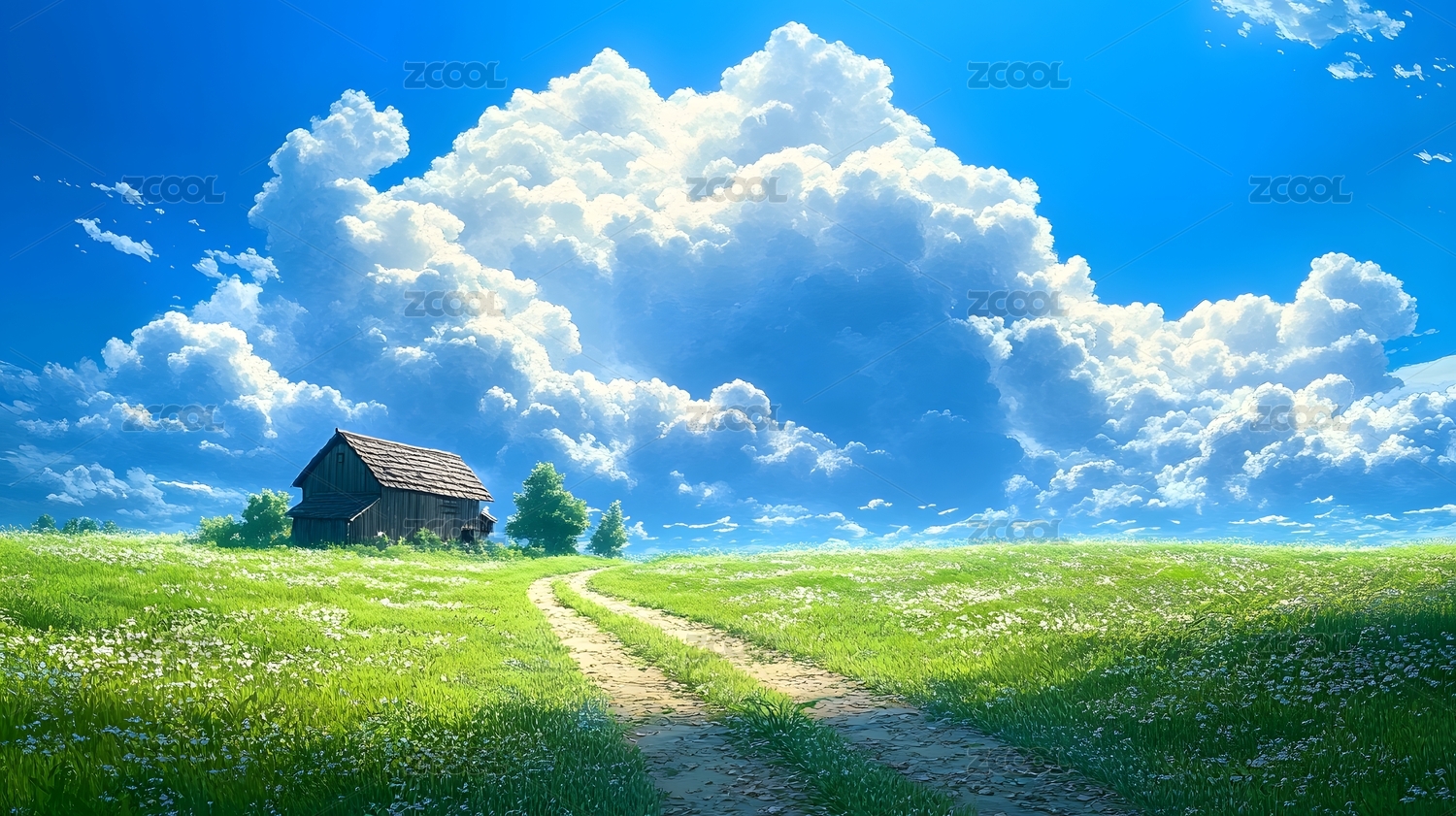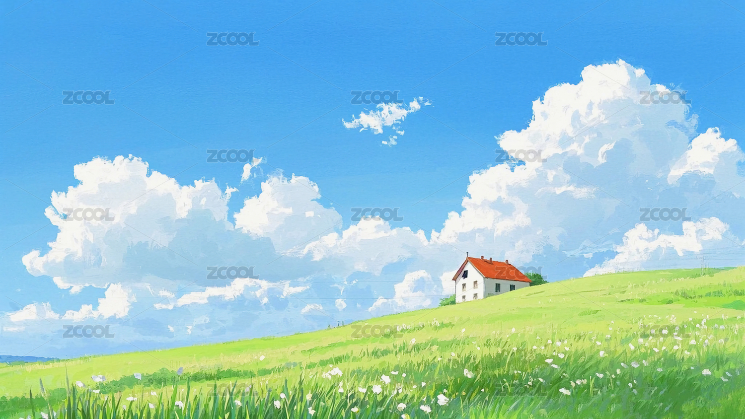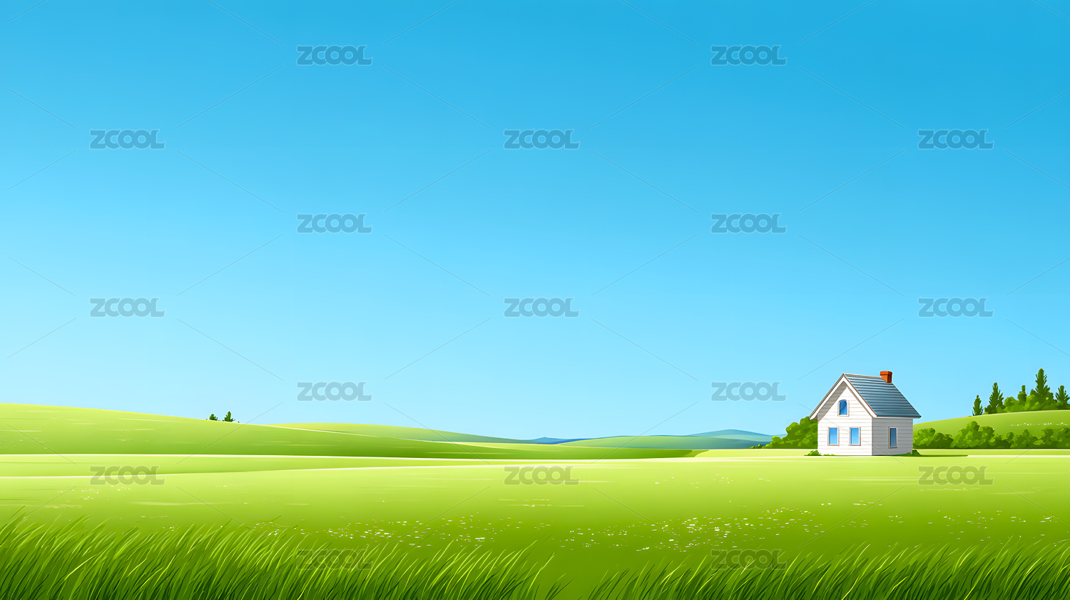 草原,房屋,绿色,蓝色,白色,绘画,柔和,几何,水彩,油画