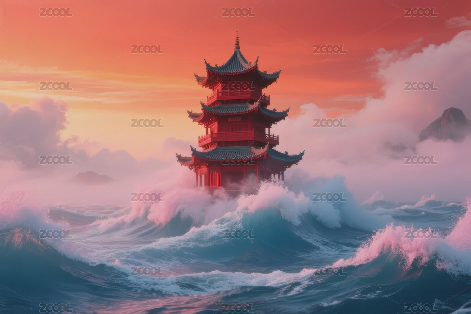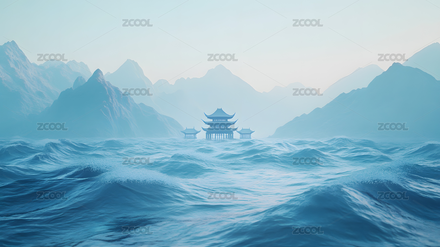 蓝色,波浪,山,亭子,树,中国,景观,传统,假山,湖